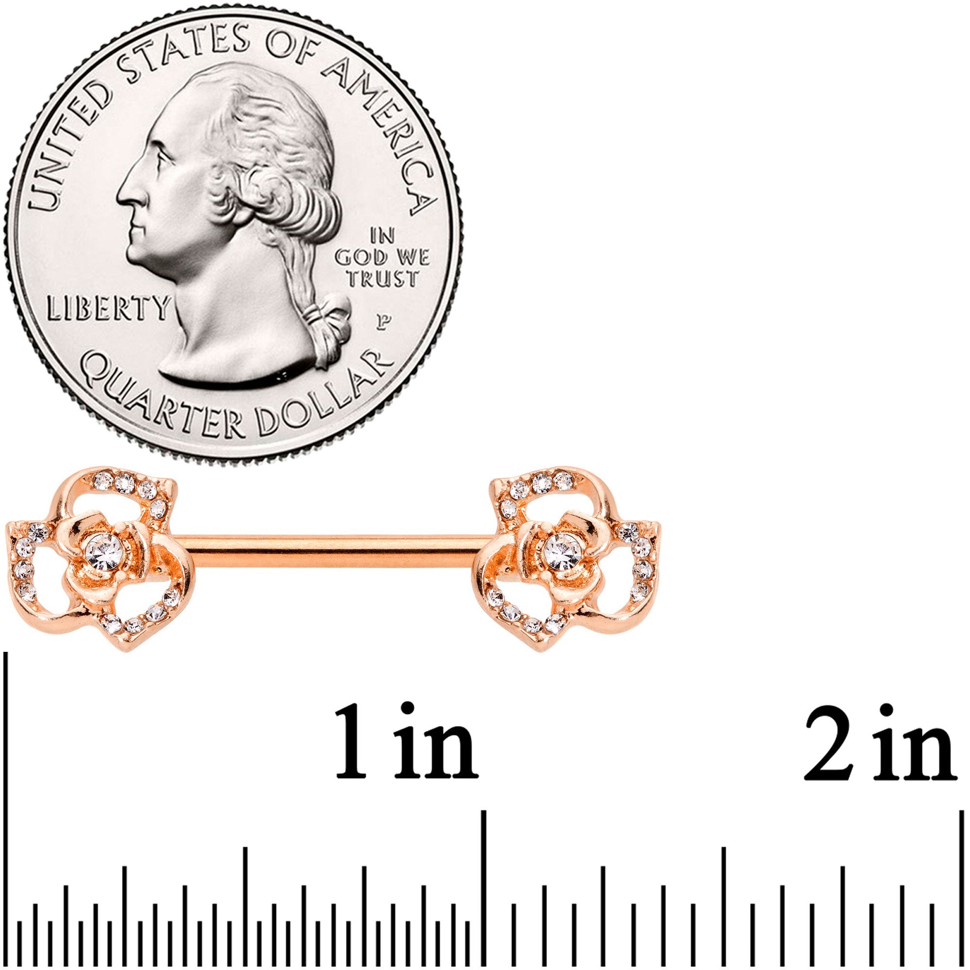 A rose by any other name wouldn't be half as lovely as this pair of 14 gauge nipple piercings. They're 14mm in length and made with rose gold tone plated over 316L surgical grade stainless steel straight barbells. Each rose is highlighted with several small clear gems giving them an overall elegance without losing that lovely feel of opulence that rose gold hues brings. These are roses that you'll want in your garden all year round! Sold as a set of two.