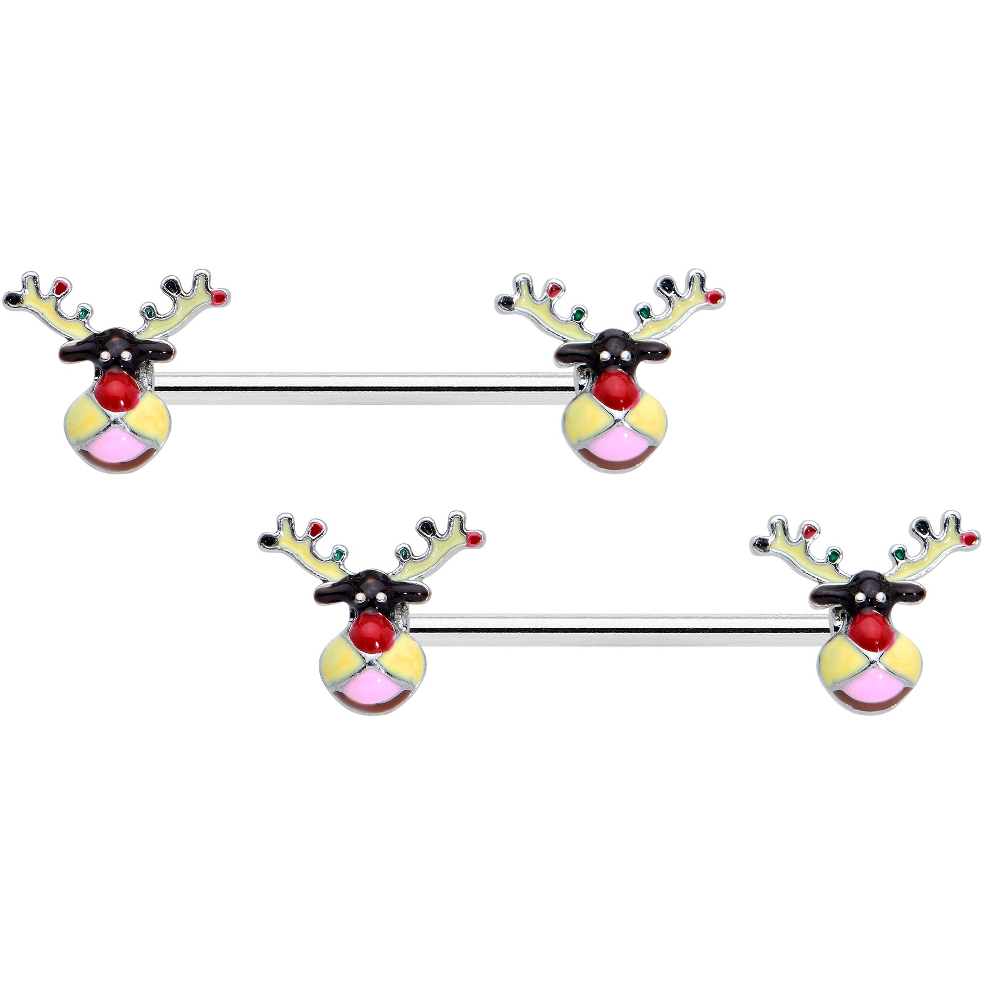 14 Gauge 9/16 Colorful Reindeer Christmas Barbell Nipple Ring Set