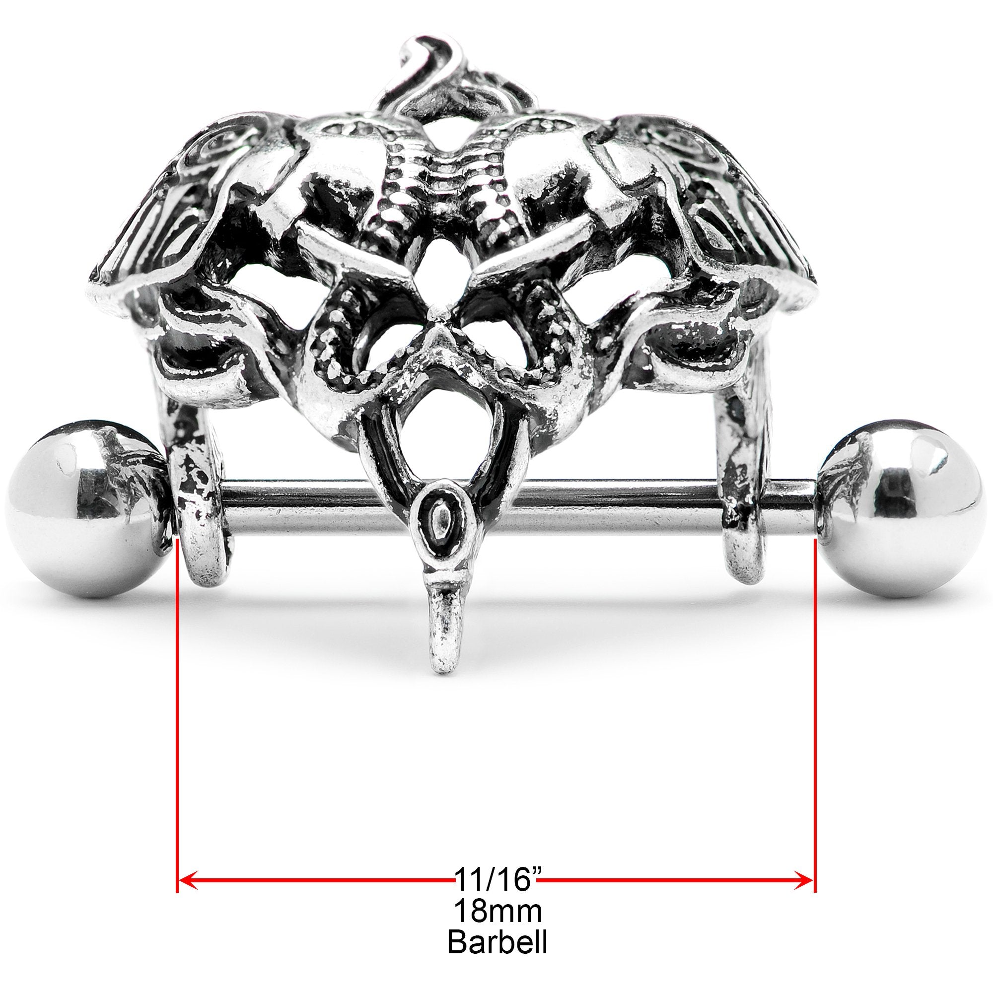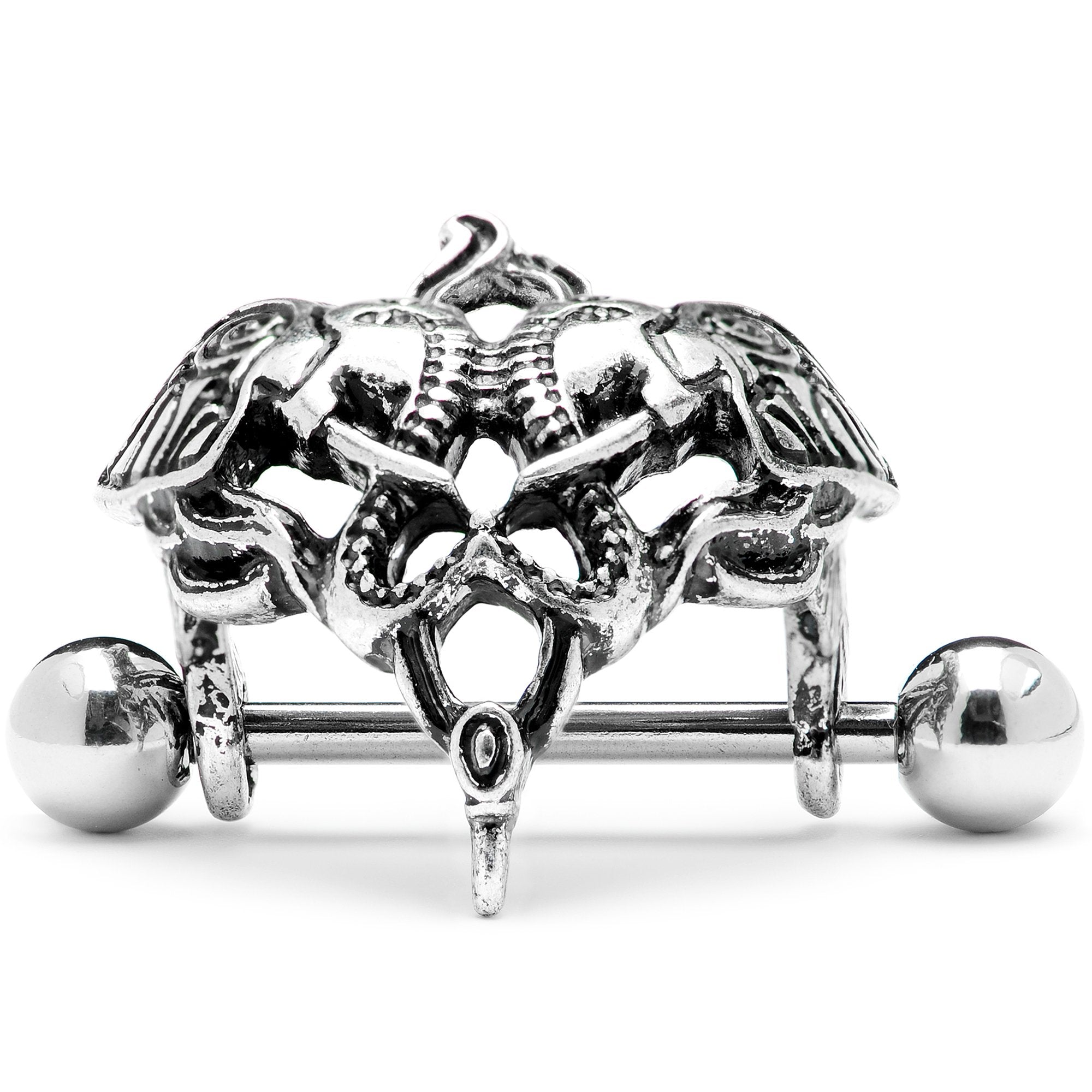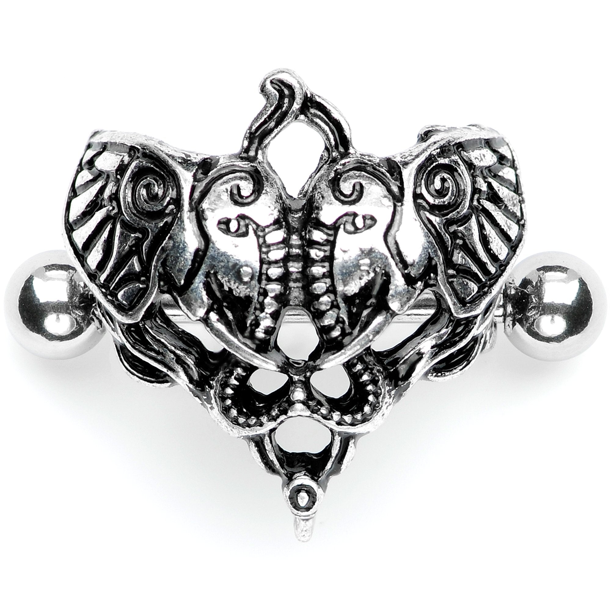 Are these elephants preparing for battle or just gazing lovingly into one another's eyes? These 14 gauge nipple piercings feature two ornately decorated elephant faces looking at each other across 14mm durable 316L surgical grade stainless steel straight barbells. Each shield has a width of 9mm and a rise of 13mm for a perfect fit. Perhaps the elephants are simply admiring how gorgeous they are and once you see them, you will too. Sold as a pair.