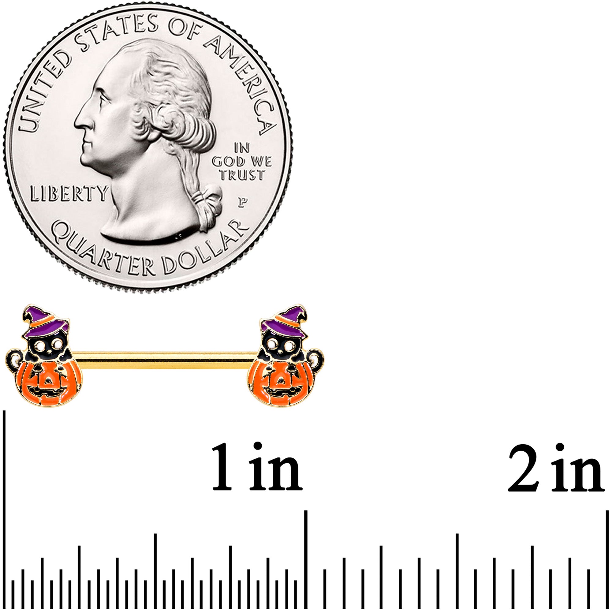 14G 9/16 Gold Hue Black Witch Cat Pumpkin Barbell Nipple Ring Set