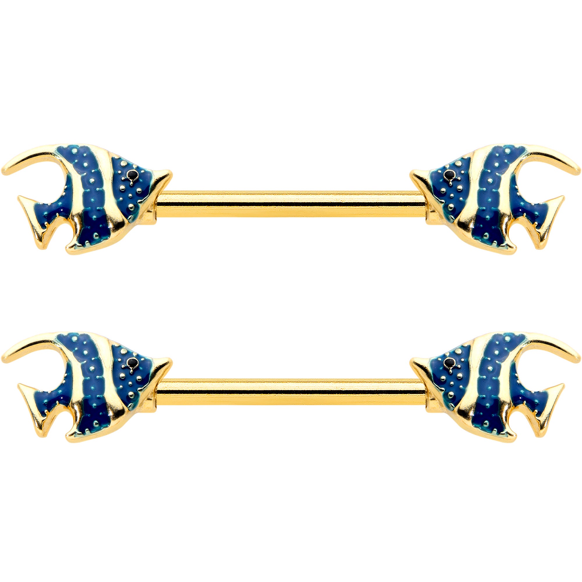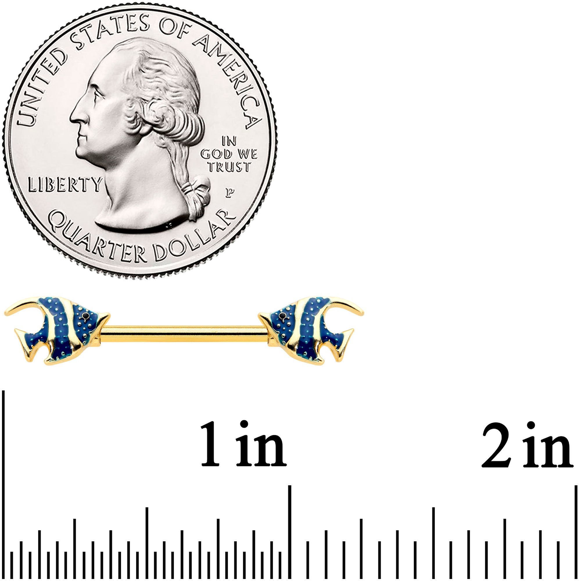 14G 9/16 Gold Tone Blue Stripe Adorable Angelfish Nipple Ring Set