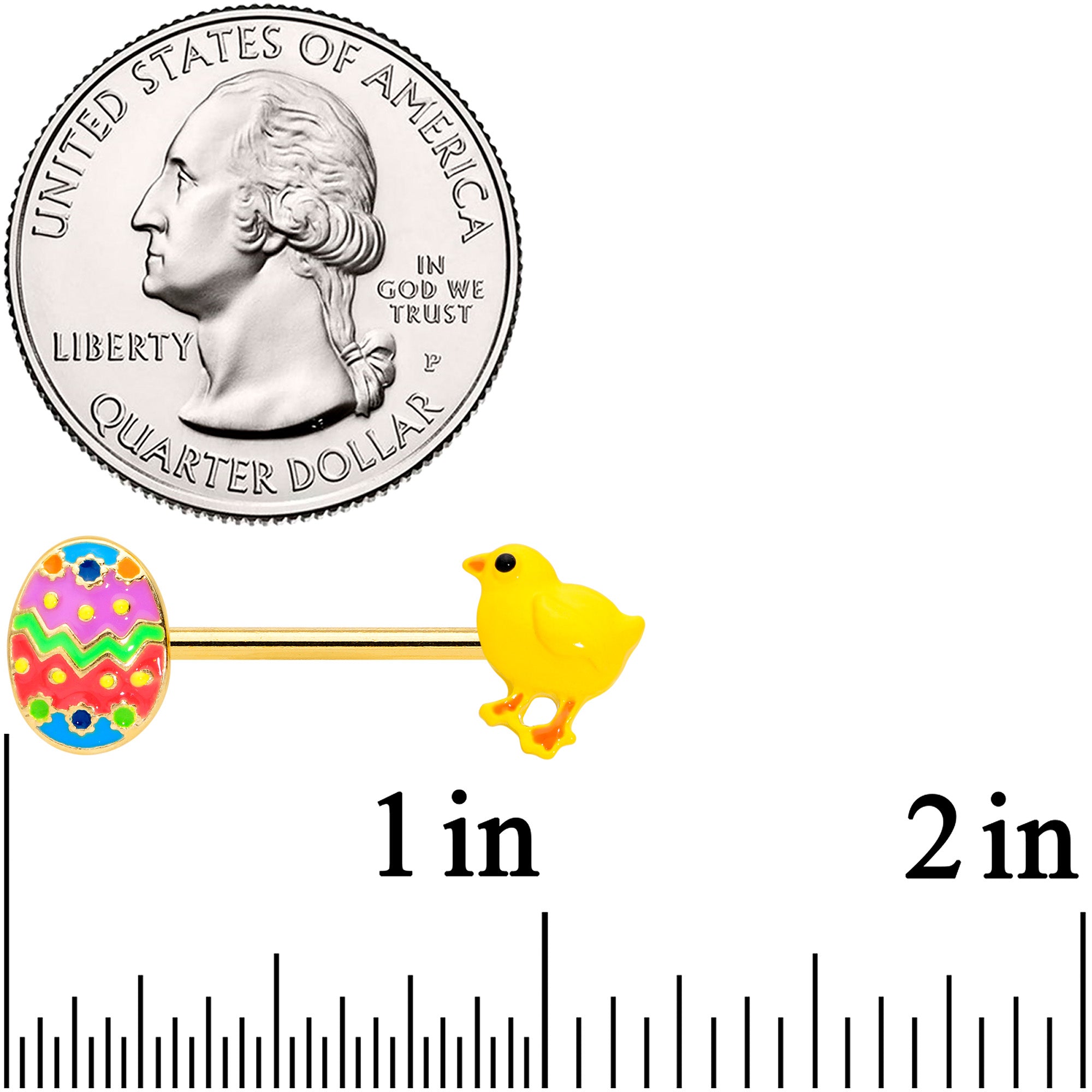 Get wild this Easter with this 14 gauge chick and egg nipple jewelry! It's made with 14mm gold tone PVD over 316L surgical grade stainless steel straight barbells. One end features a yellow Easter chick charm. The chicks are each embellished with a black eye and realistically orange legs and feet. The other end features an Easter egg charm, decorated with wild stripes of purple, green, orange, and blue. Hatch a colorful new look for Easter with these festive chick and egg nipple piercing rings! Sold as a set of two.