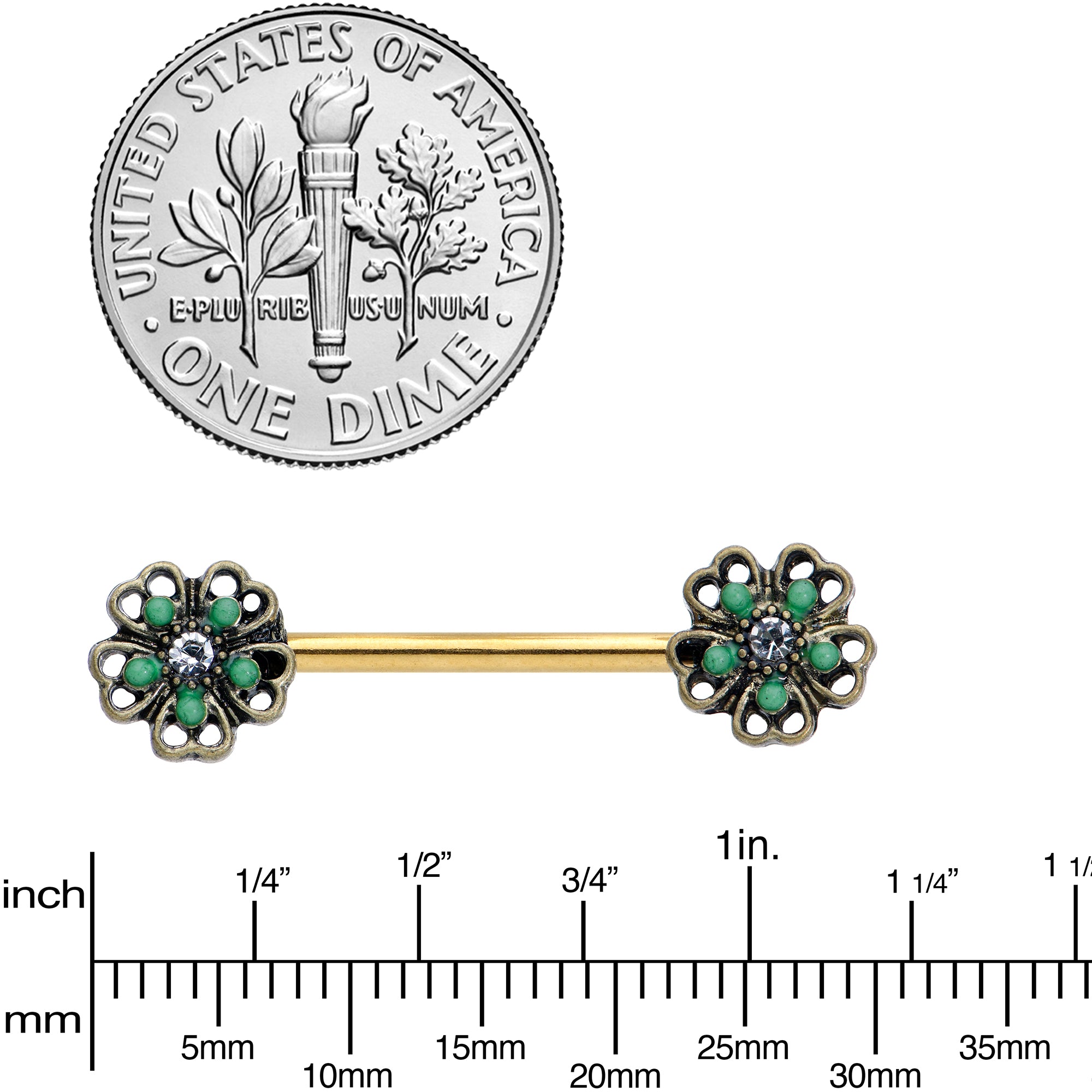 14G 9/16 Gold Tone Green Flower St Patricks Day Nipple Ring Set