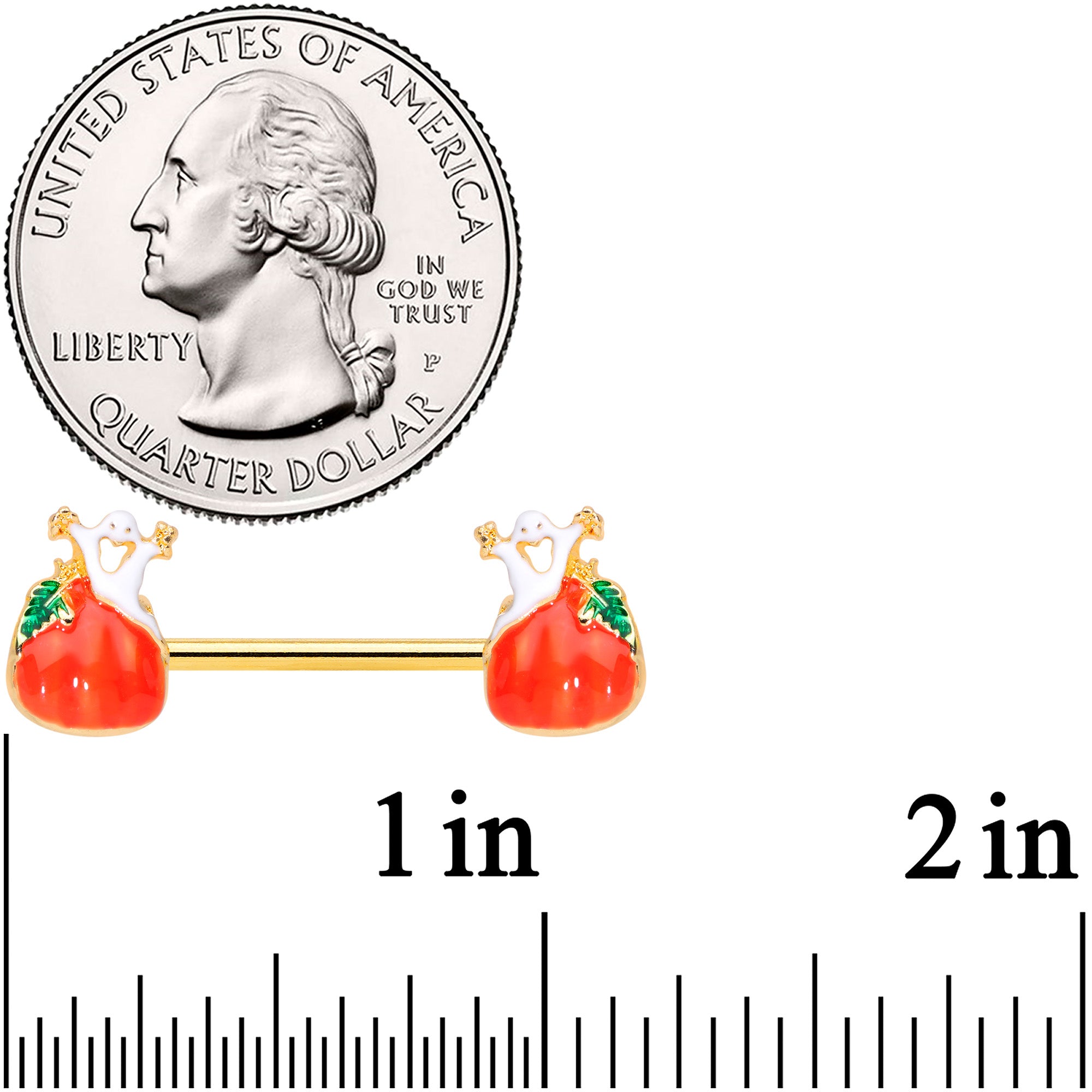 Oooh, this 14 gauge nipple jewelry is downright haunting! It's made with 14mm gold tone PVD over 316L surgical grade stainless steel straight barbells. Each of the end features an orange pumpkin charm embellished with textured detailing and a small green leaf. Appearing to rise from within the pumpkin is a ghost, with a cut-out mouth in a wide smile. These happy Halloween haunters are sure to glam up your nipple piercings just in time to give you the spirit of the season! Sold as a set of two.