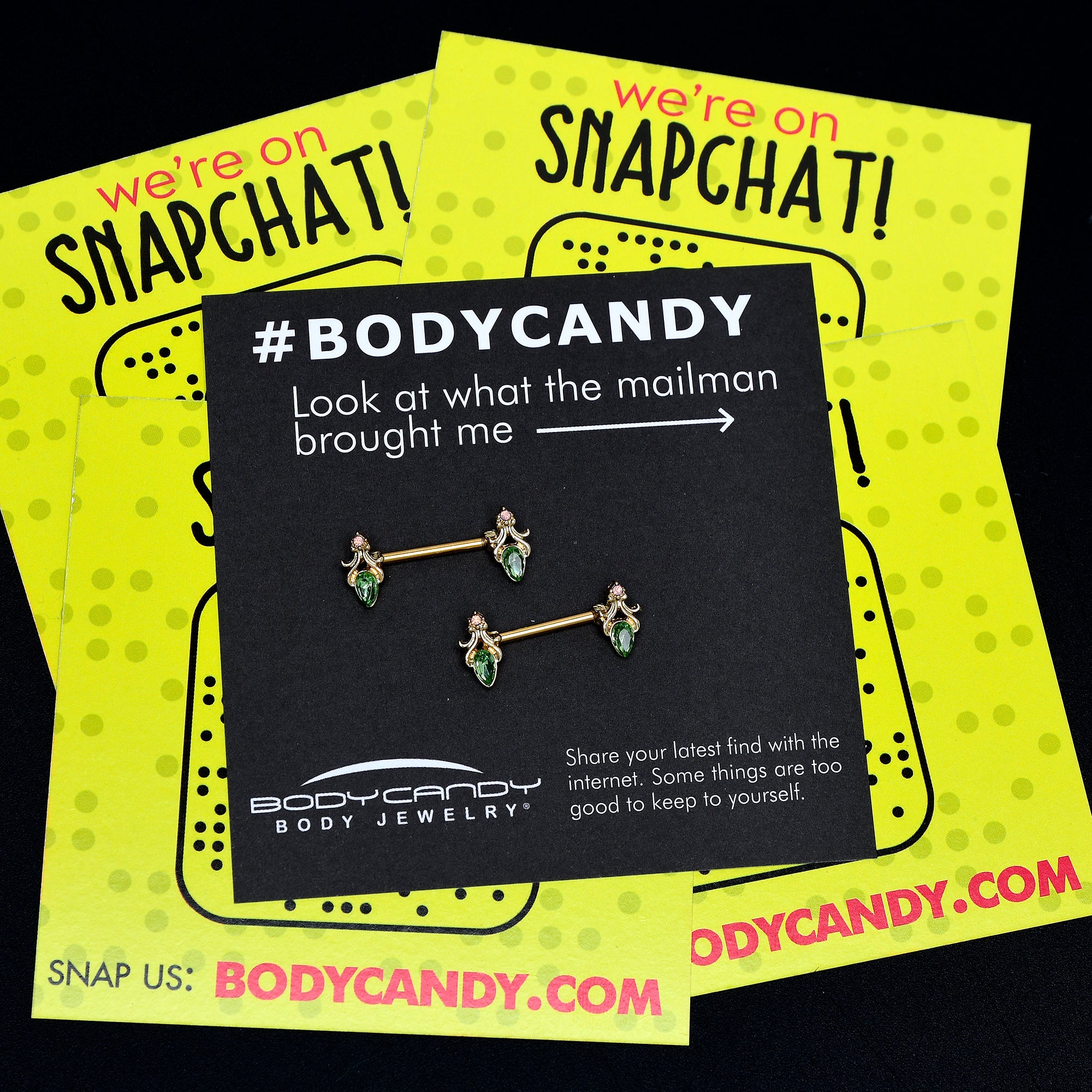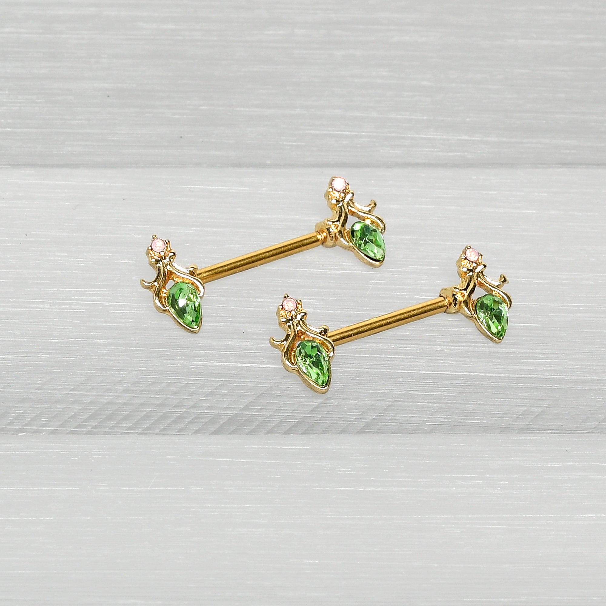 You'll be looking springtime stylish all year long with this 14 gauge nipple jewelry! It's made with 14mm gold tone PVD over 316L surgical grade stainless steel straight barbells. Each of the ends features a green gem charm, set among airy, openwork detailing and topped with a pink orb for a truly vernal appearance. Add some springtime color to your look with these elegantly simple nipple piercing rings! Sold as a set of two.