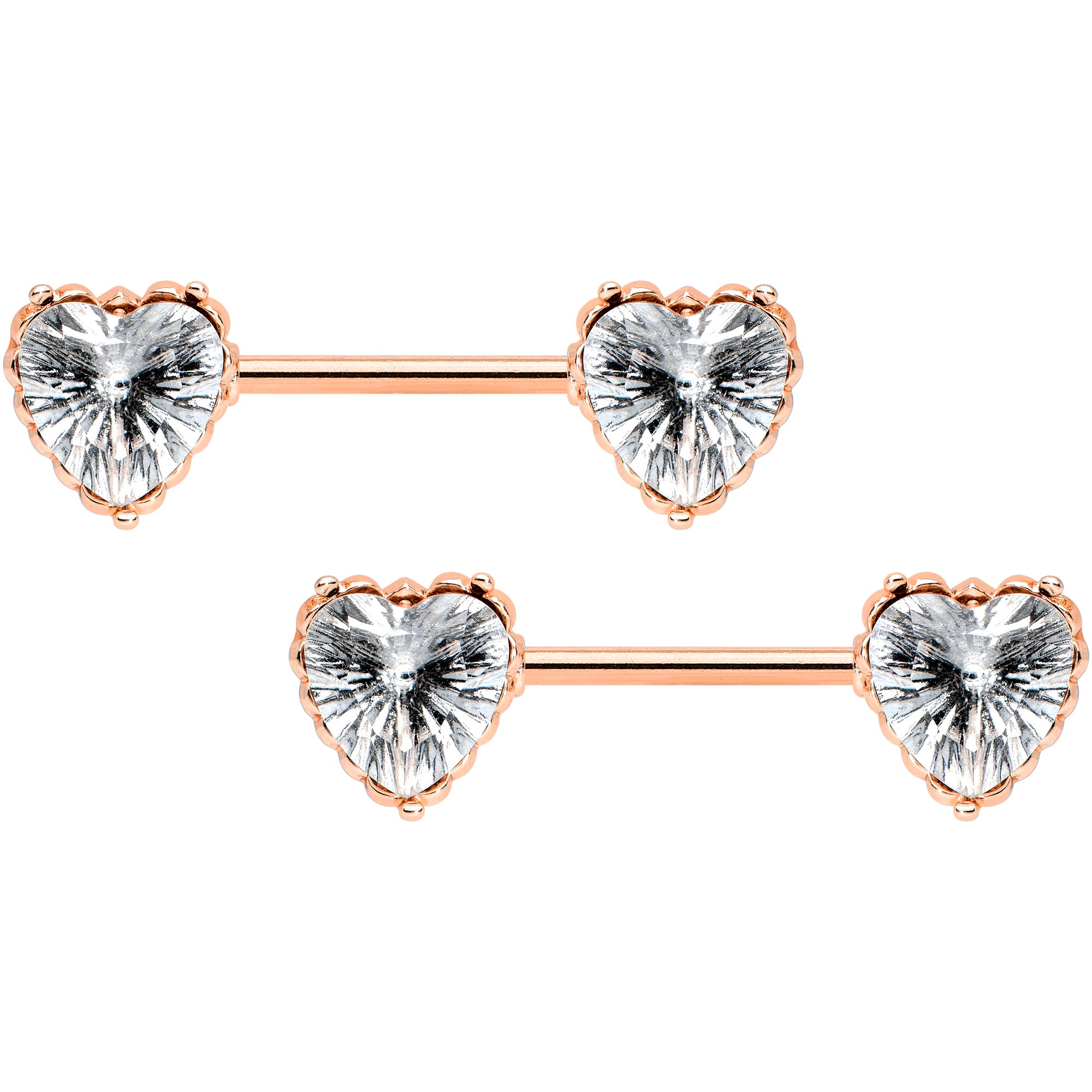 14G 9/16 Grey CZ Gem Rose Gold Tone Heart Nipple Ring Set