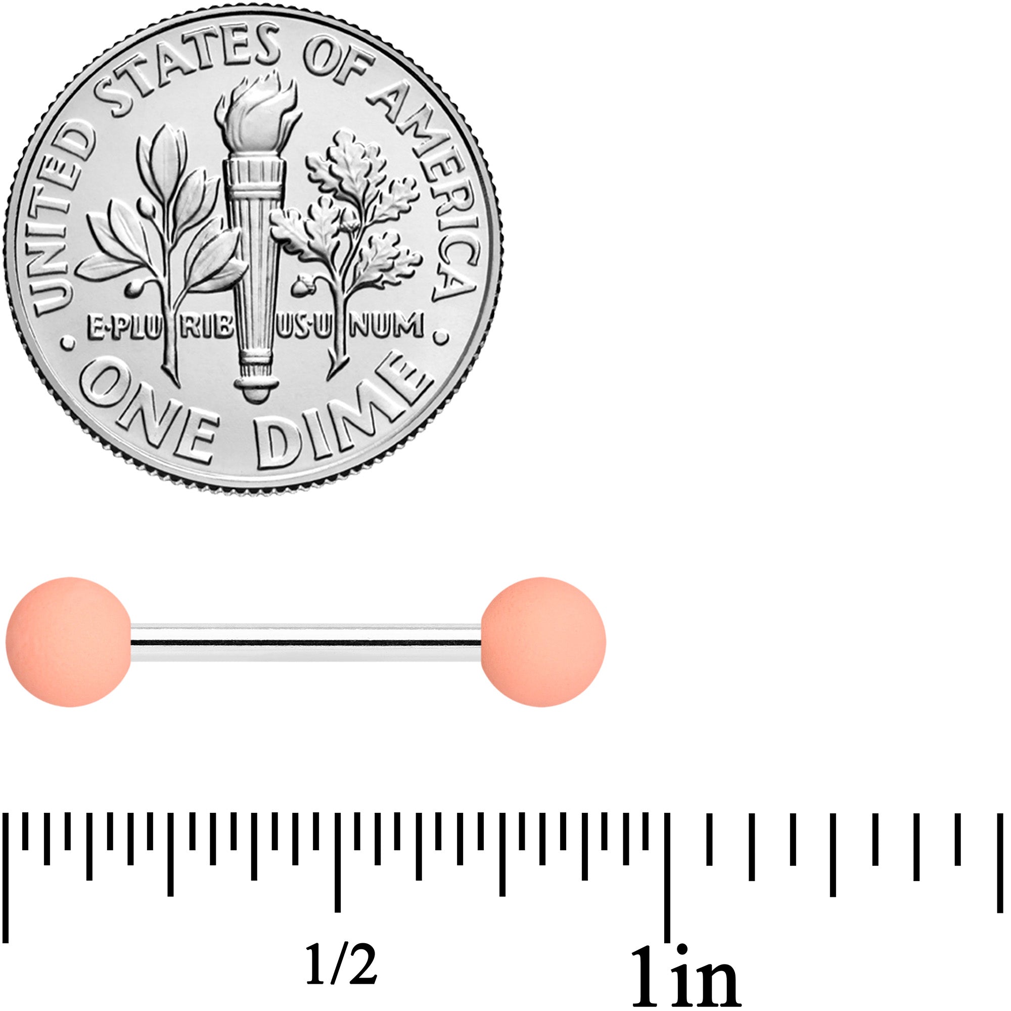 Simple style and peachy-keen peach combine to make comfortable and dainty nipple jewelry with these 14 gauge nipple rings! They're made with 14mm durable 316L surgical grade stainless steel straight barbells. The 5mm ball ends are peach color with a subtly soft, matte finish to them. Keep it simple while still keeping it stylish with these punchy, peachy keen nipple rings! Sold as a set of two.