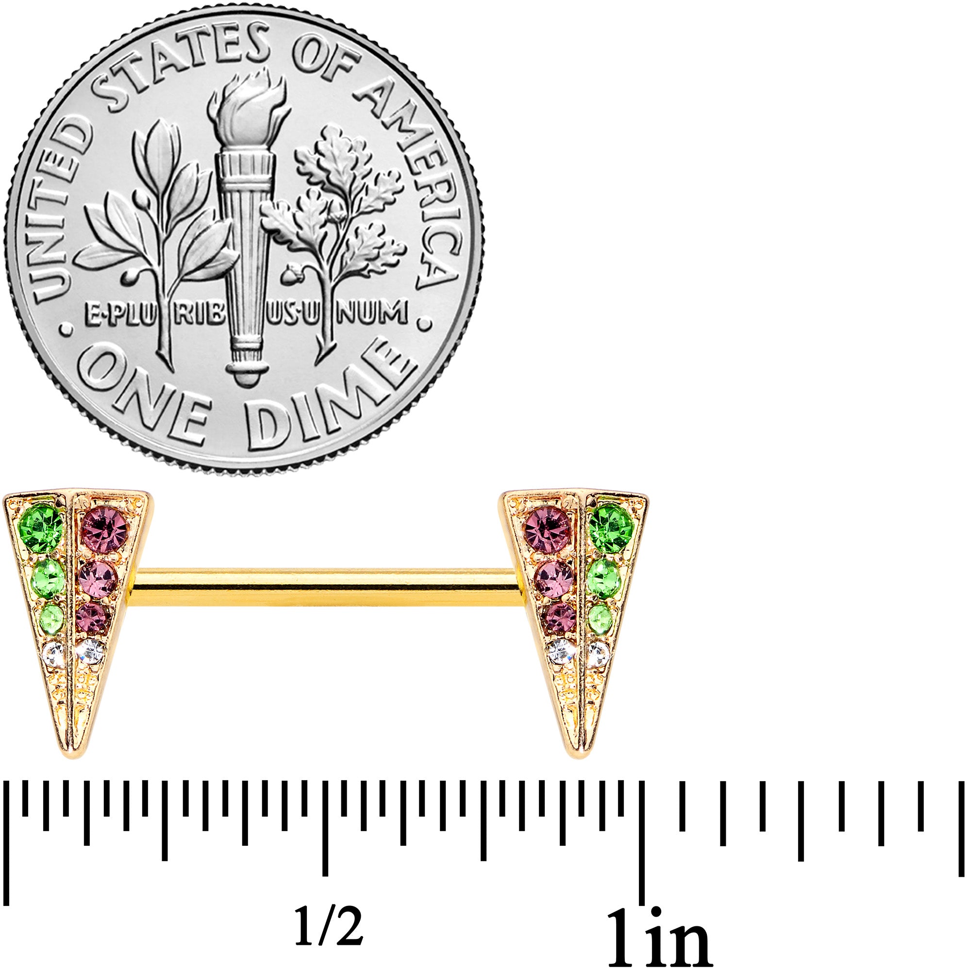 14 Gauge 9/16 Pink Green Gem Gold Hue Triangle Barbell Nipple Ring Set