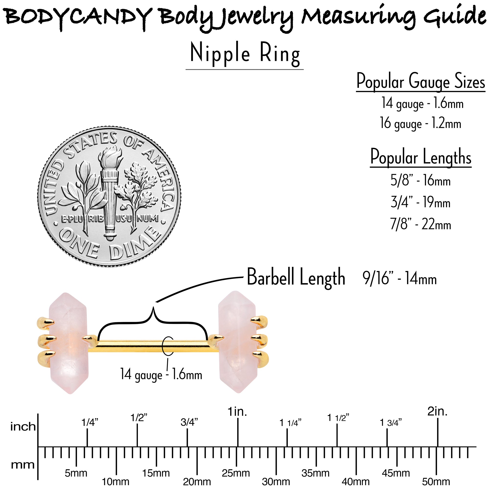 If you're into crystals and incense, this 14 gauge nipple jewelry is sure to give you a happier aura! It's made with a 14mm gold tone PVD over 316L surgical grade stainless steel straight barbells. Bound to each end of the barbell is a band is a pink rose quartz, with its classic obelisk shape held in a claw-style setting. While we can't claim they have any magical powers, they will certainly look magical in your nipple piercings! Sold as a set of two.