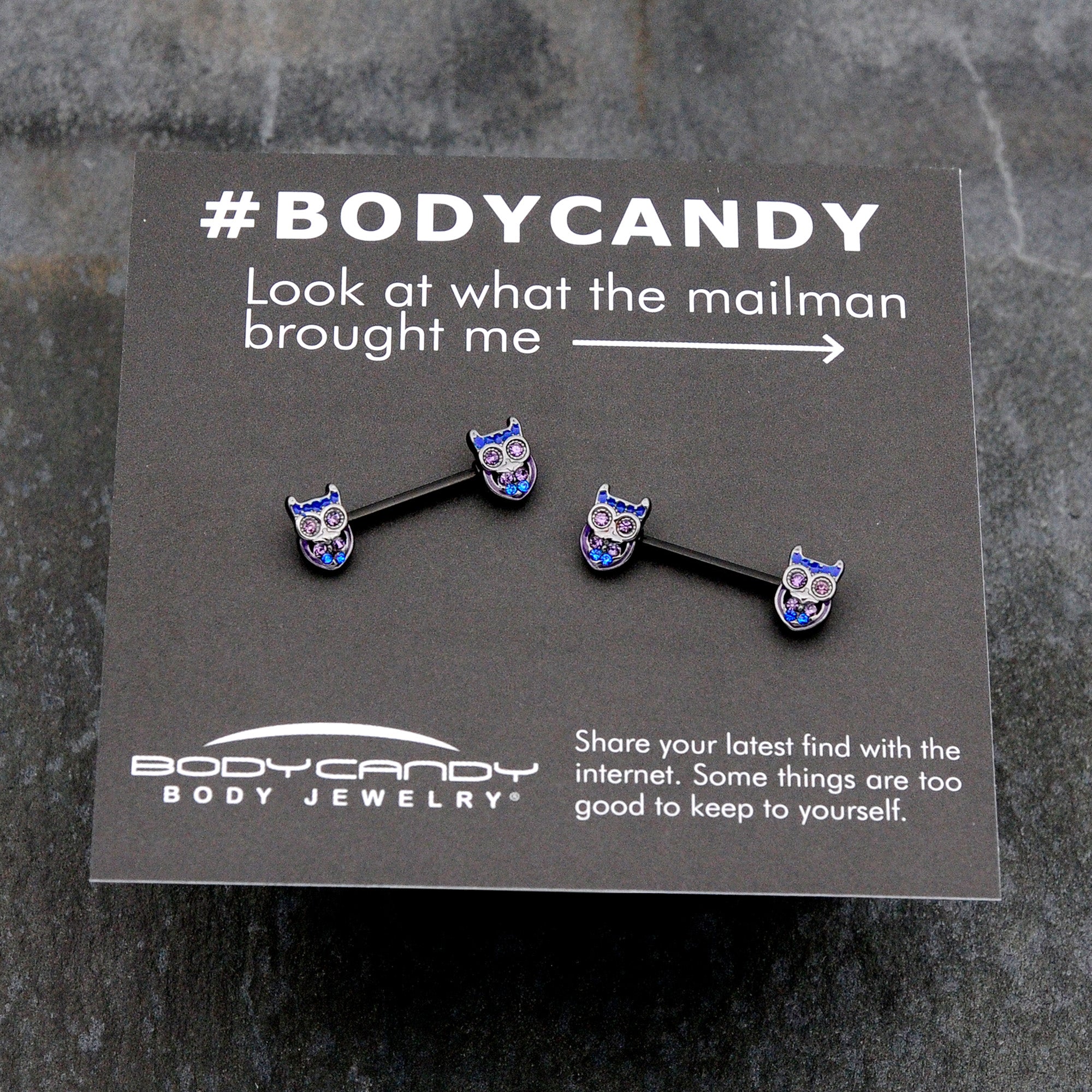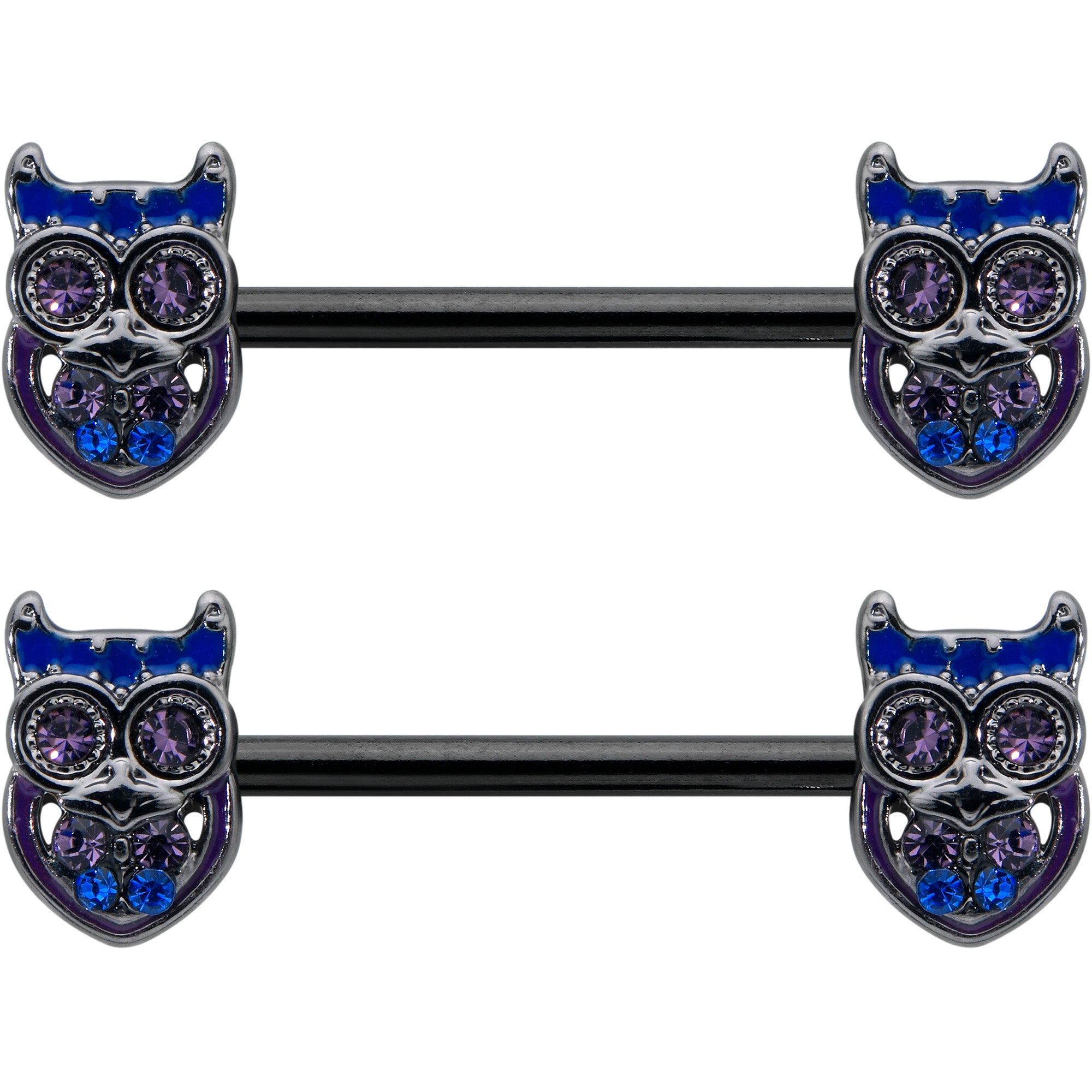 14G 9/16 Purple Blue Gem Black Opulent Owl Barbell Nipple Ring Set