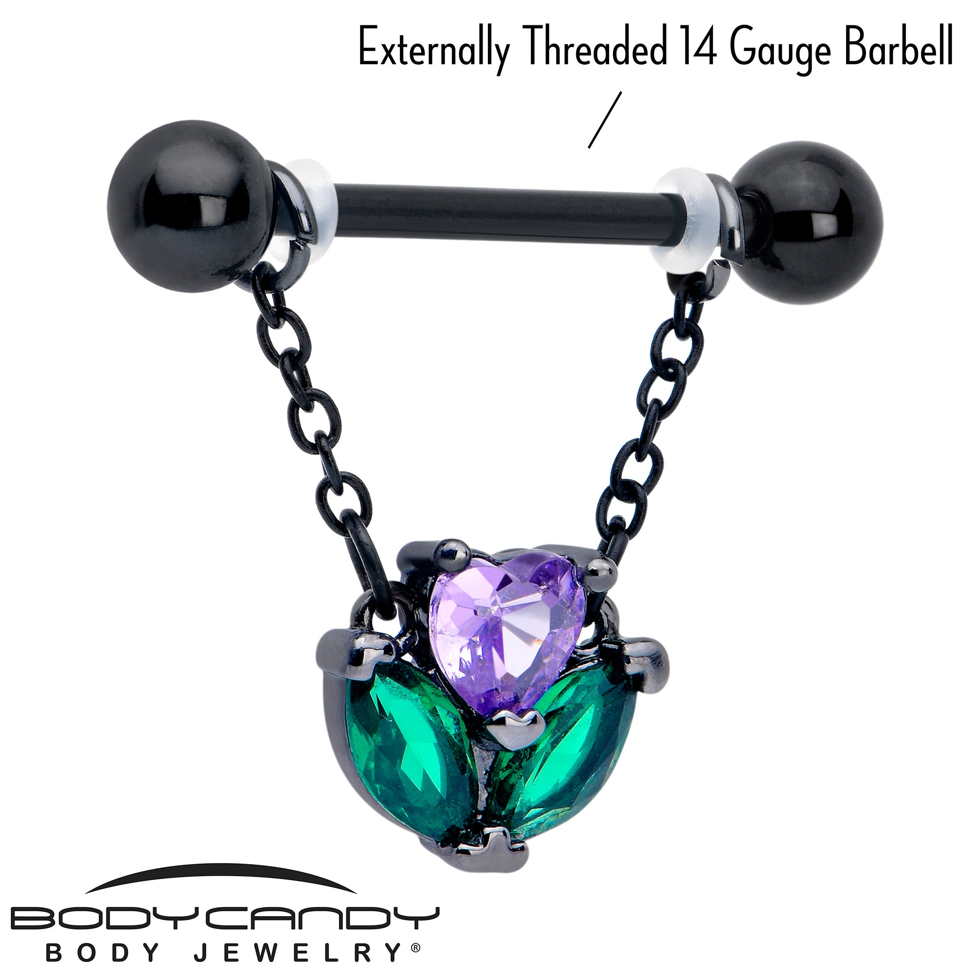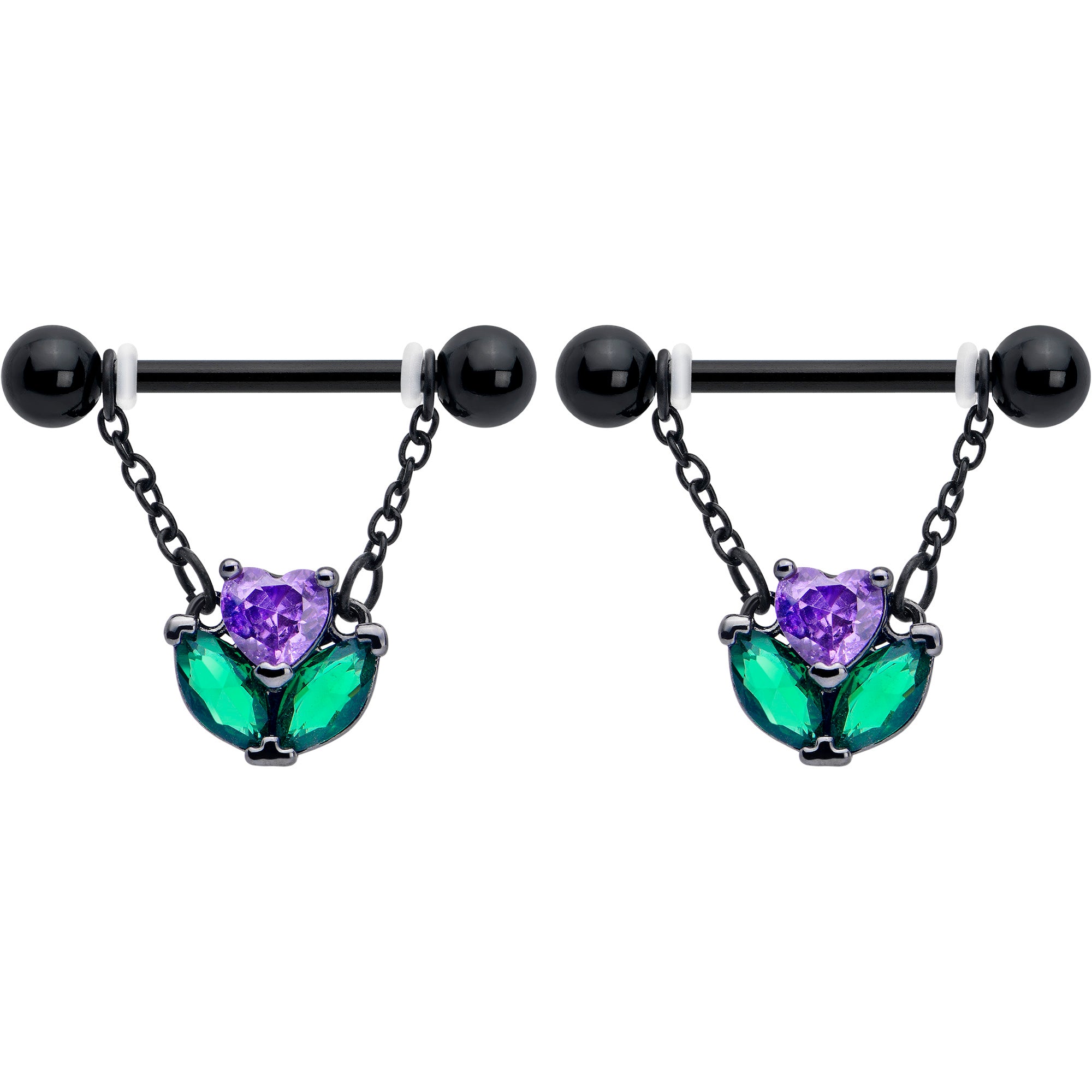 Let love bloom along with your look when you're rocking this 14 gauge nipple jewelry. It's made with 14mm black PVD over 316L surgical grade stainless steel straight barbells with 5mm ball ends. Each barbell supports a double length of matching dangle chain, Dangling from each pair of chains is a flower charm with green cubic zirconia gem leaves. The blossoms are composed of purple cubic zirconia gem hearts for a sweetly romantic touch you can't help but love. Let your love flower in style with these romantic nipple piercing rings. Sold as a set of two.