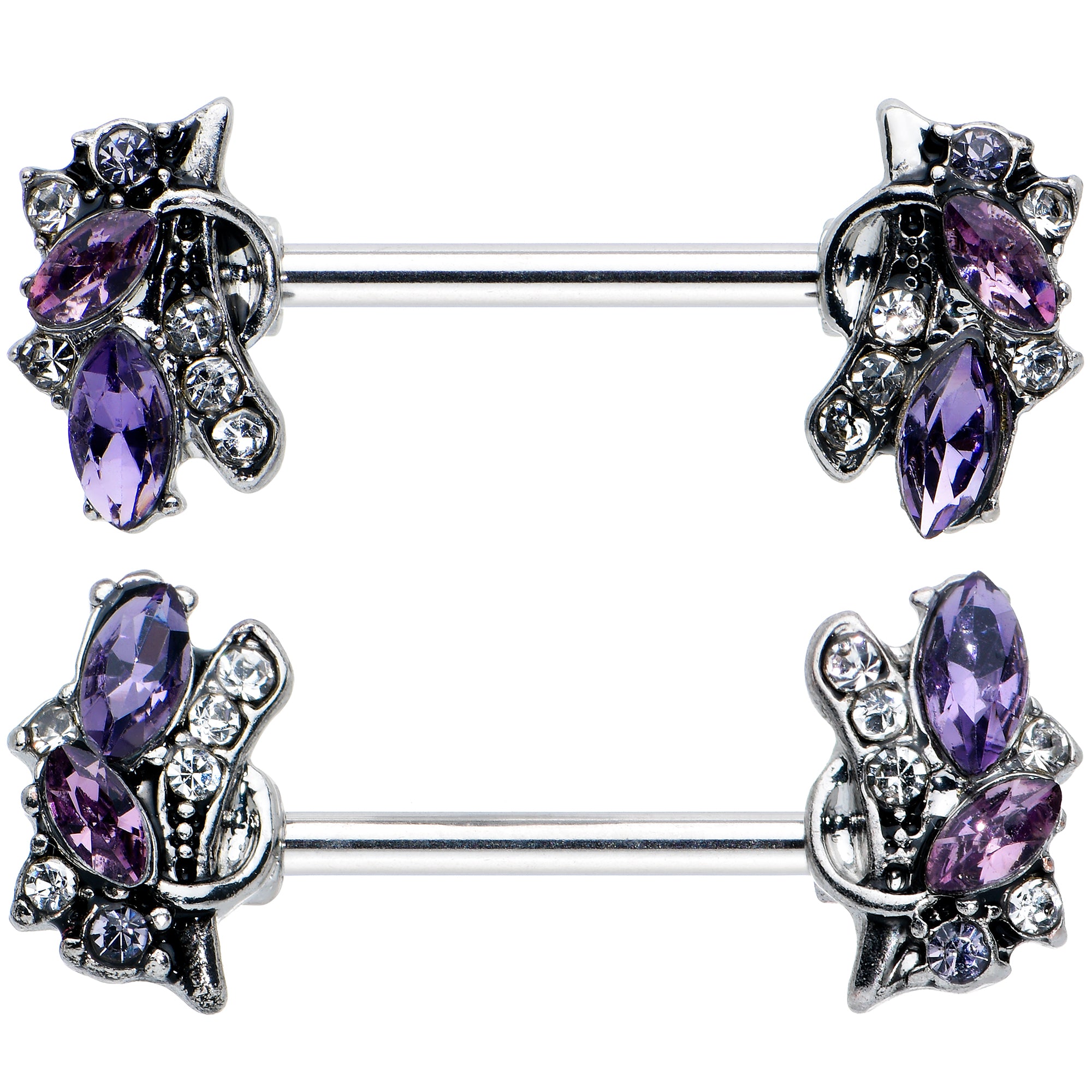Add some rich color and abstract style to your look with this 14 gauge nipple jewelry! It's made with 14mm durable 316L surgical grade stainless steel straight barbells. Each of the ends features an abstract charm with deep purple gems in oval shapes. They're embellished with clear gems for an opulent look and stylish contrast that really makes this nipple piercing jewelry stand out in a crowd! Add some artistic abstract elegance to your look when you're rocking these colorful nipple rings! Sold as a set of two.
