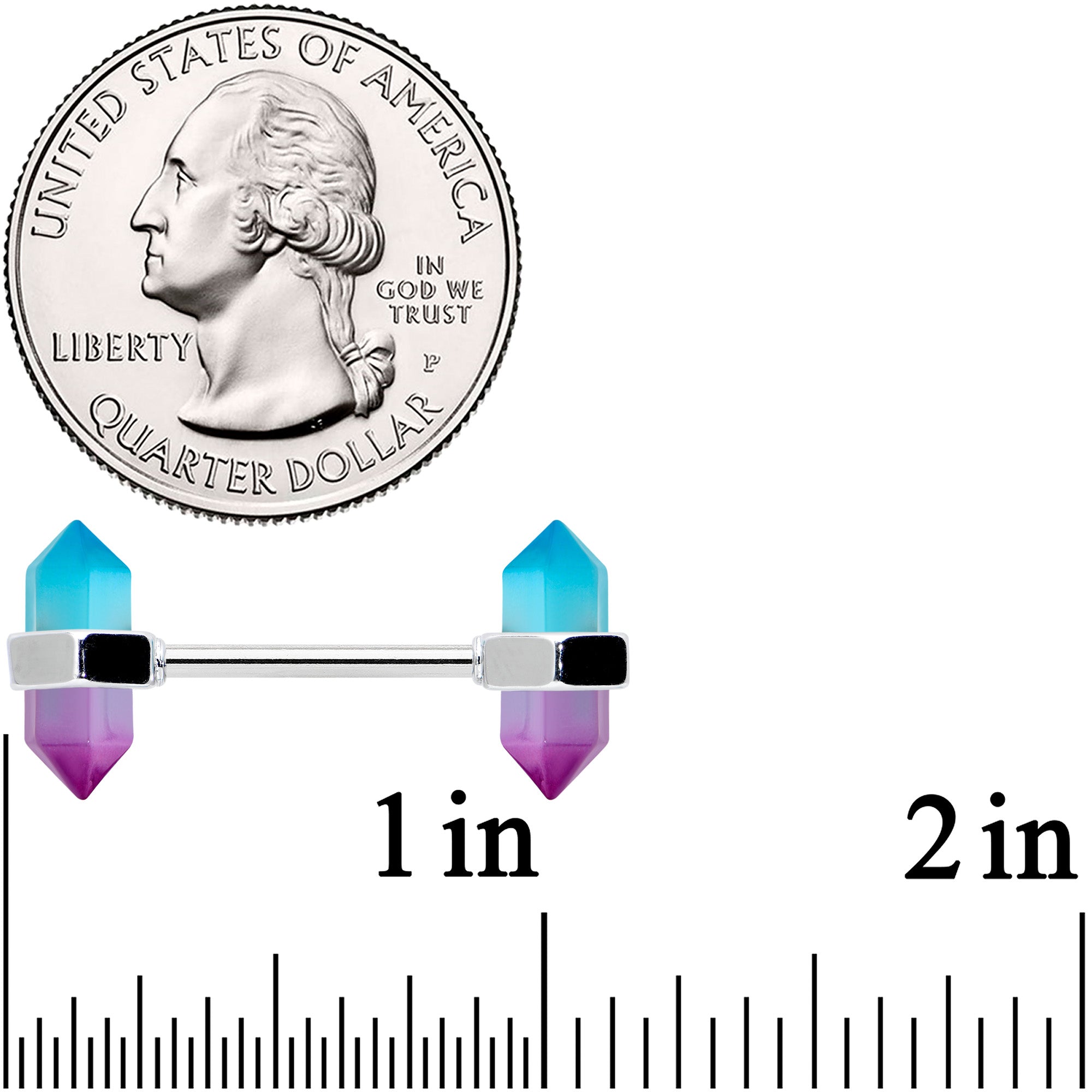 If you're into tie-dye and incense, this 14 gauge nipple jewelry is sure to give you a happier aura! It's made with 14mm durable 316L surgical grade stainless steel straight barbells. Each end features a band holding a vertical tourmaline in blue and purple ombre, with its classic obelisk shape. While we can't claim they have any magical powers, they will certainly look magical in your nipple piercings! Sold as a set of two.
