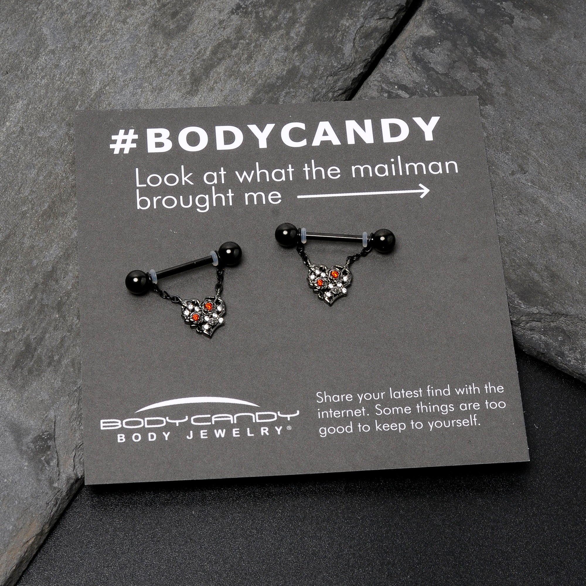 Let the love blossom when you are rocking this 14 gauge nipple jewelry. It is made with 14mm black PVD over 316L surgical grade stainless steel straight barbells with 5mm ball ends. Each barbell supports a dangling length of matching chain. Each chain features a heart charm, embellished with clear cubic zirconia gems. The hearts also feature a pair of flowers with red cubic zirconia gem centers and twining vines. Give your nipple piercings some new goth glamour with these floral heart nipple piercing rings. Sold as a set of two.