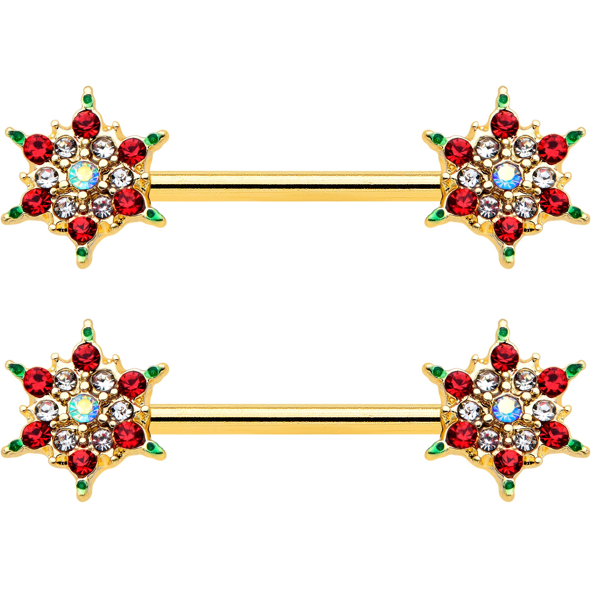 Even if you're not rolling in cash, you can look super rich when you're rocking this 14 gauge nipple jewelry this Christmas! It's made with 14mm gold tone PVD over 316L surgical grade stainless steel straight barbells. Each of the ends features a snowflake charm with rich red gem and green embellishments, connected with a ring of clear gems and finished with an aurora gem center. Whether you're rich or just have upscale taste, these holiday nipple piercing rings will make you feel like a million bucks! Sold as a set of two.