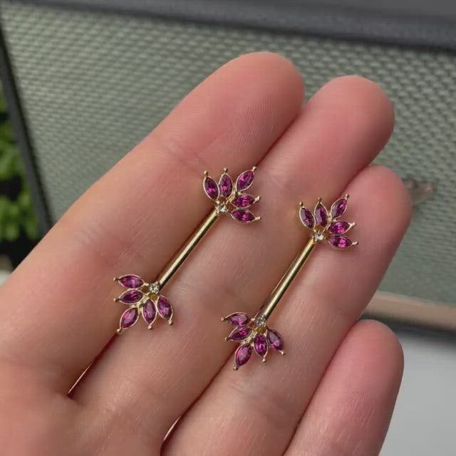 Fall in love with fall, with this 14 gauge nipple jewelry! It's made with14mm gold tone PVD over 316L surgical grade stainless steel straight barbells. Each of the ends features a charm of deep red gems, shaped like ovals. They're arranged in a manner that's inspired by autumn leaves, a look further reinforced by their gorgeous burgundy color. They're further embellished with a small clear gem at the base. You'll be falling all over yourself to get your hands on this alluring, autumnal nipple piercing jewelry! Sold as a set of two.