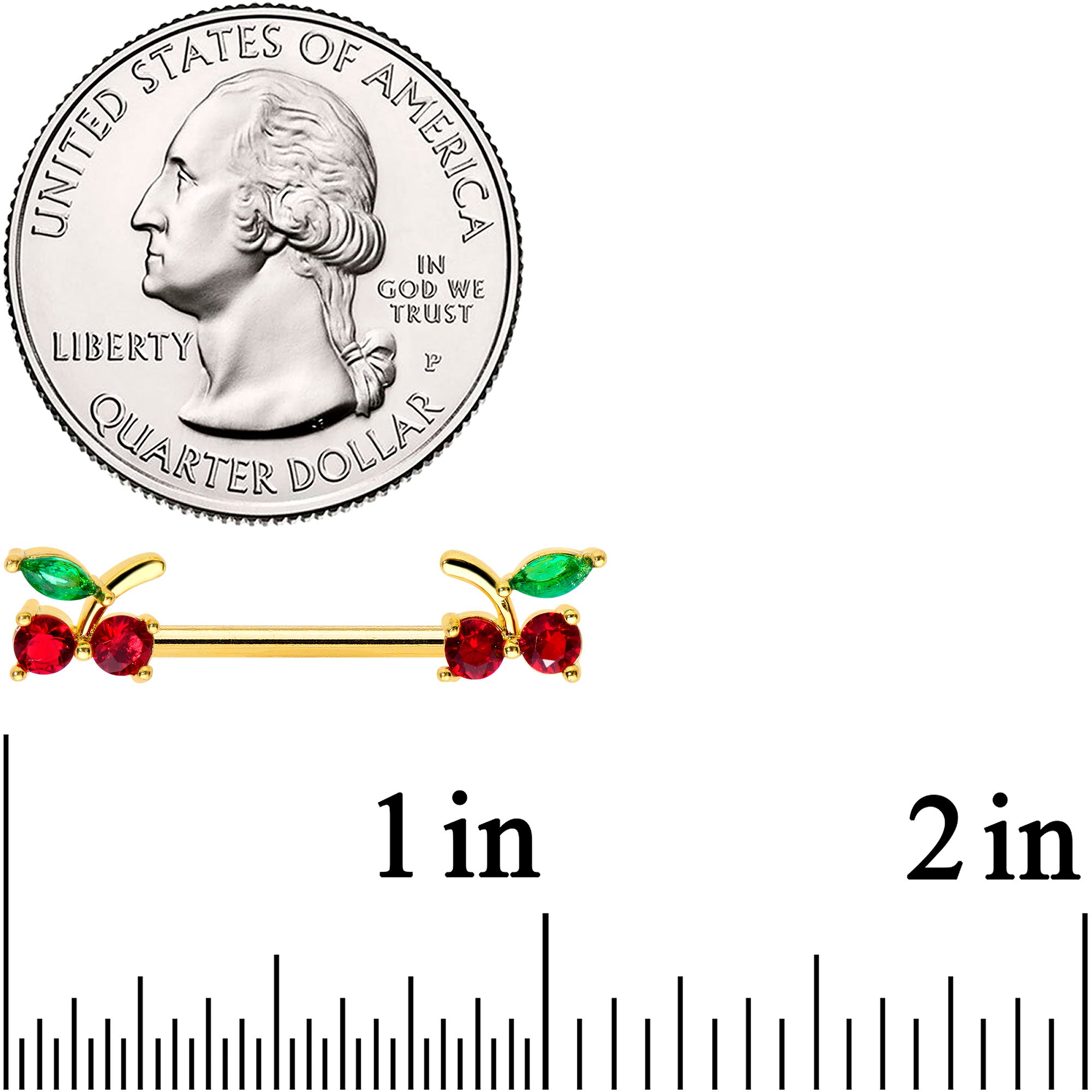 14G 9/16 Red Gem Gold Tone Tasty Cherry Barbell Nipple Ring Set