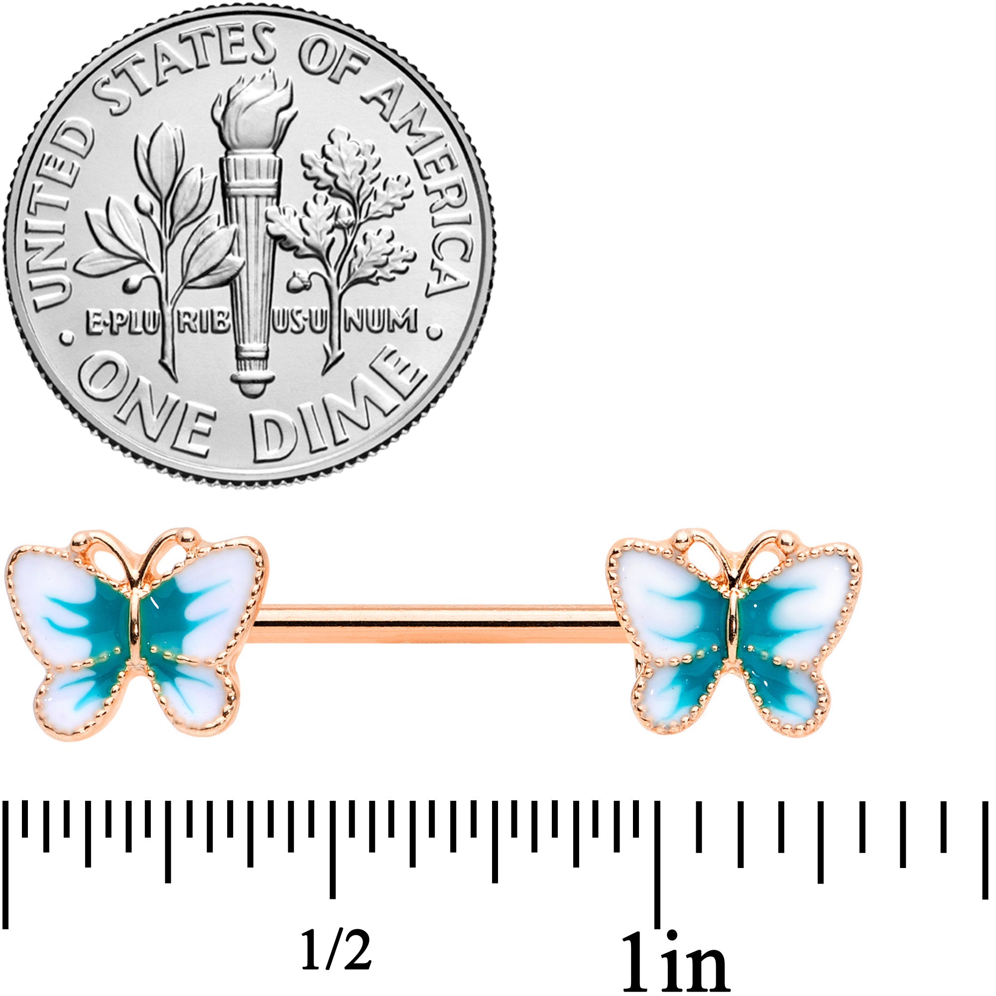 14G 9/16 Rose Gold Tone White Green Butterfly Barbell Nipple Set