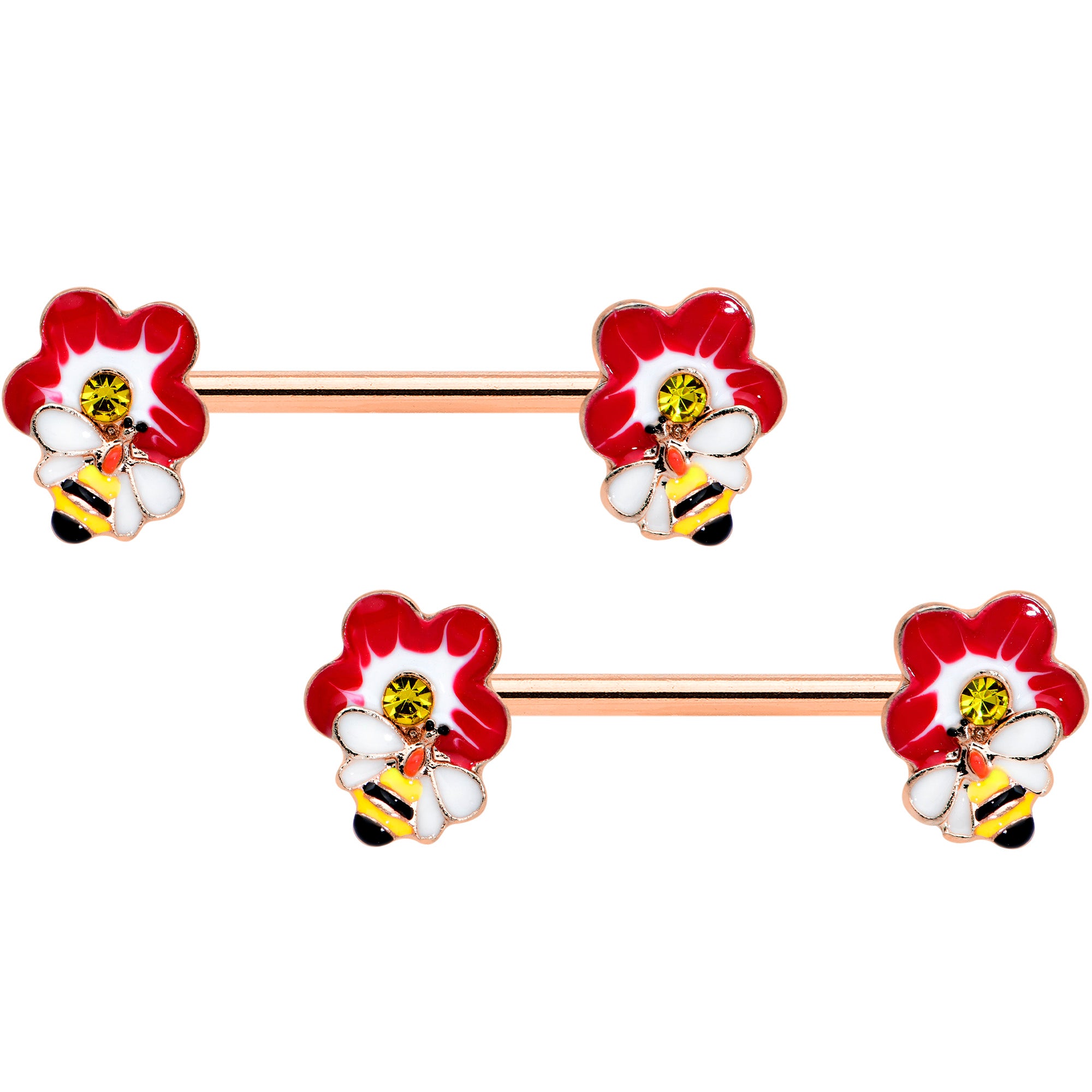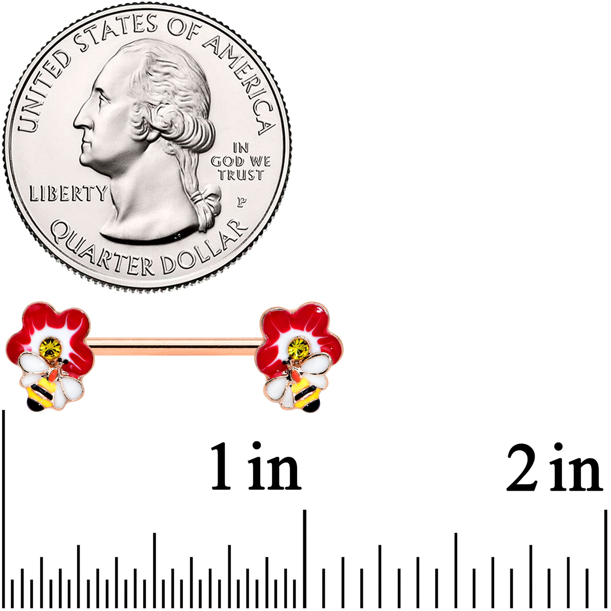 Let your nipple piercings feel like queen bees with this 14 gauge nipple jewelry. It's made with 14mm rose gold tone plated over 316L surgical grade stainless steel straight barbells. Each of the ends features a flower charm with red and white petals and a yellow gem center. The flower is embellished with a queen bee perched on it, indentifiable by the red dot on her back. Feel like the queen of the hive with these charming floral nipple piercing rings! Sold as a set of two.
