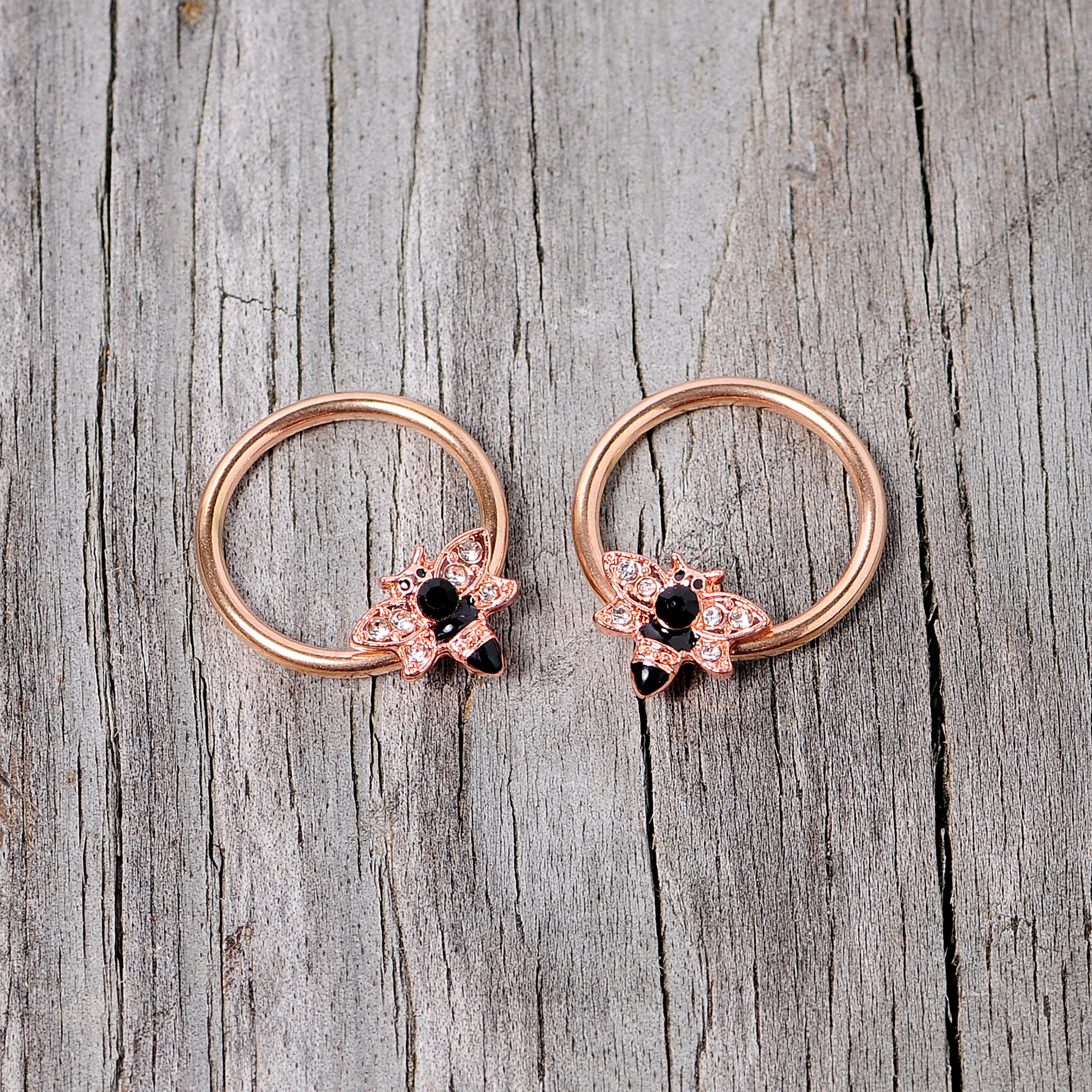 You'll be absolutely infatuated with the insects on these 14 gauge nipple rings! They're made with 14mm rose gold PVD over 316L surgical grade stainless steel circular ringsthat feature captive bee charms with black gems. The bees have clear gems set into their wings too! With these in your nipple piercings, you're sure to be all the buzz! Sold as a set of two.