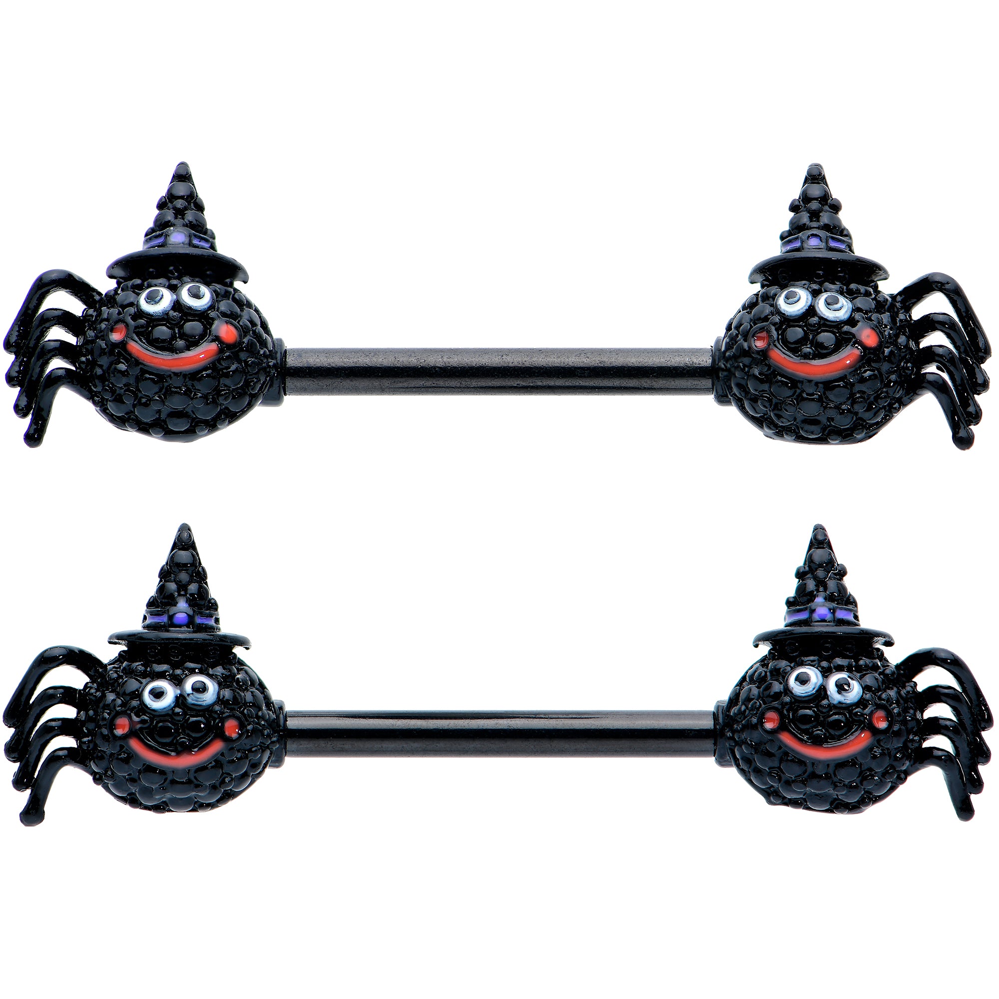 14G 9/16 Black Halloween Smiling Spider Barbell Nipple Ring Set