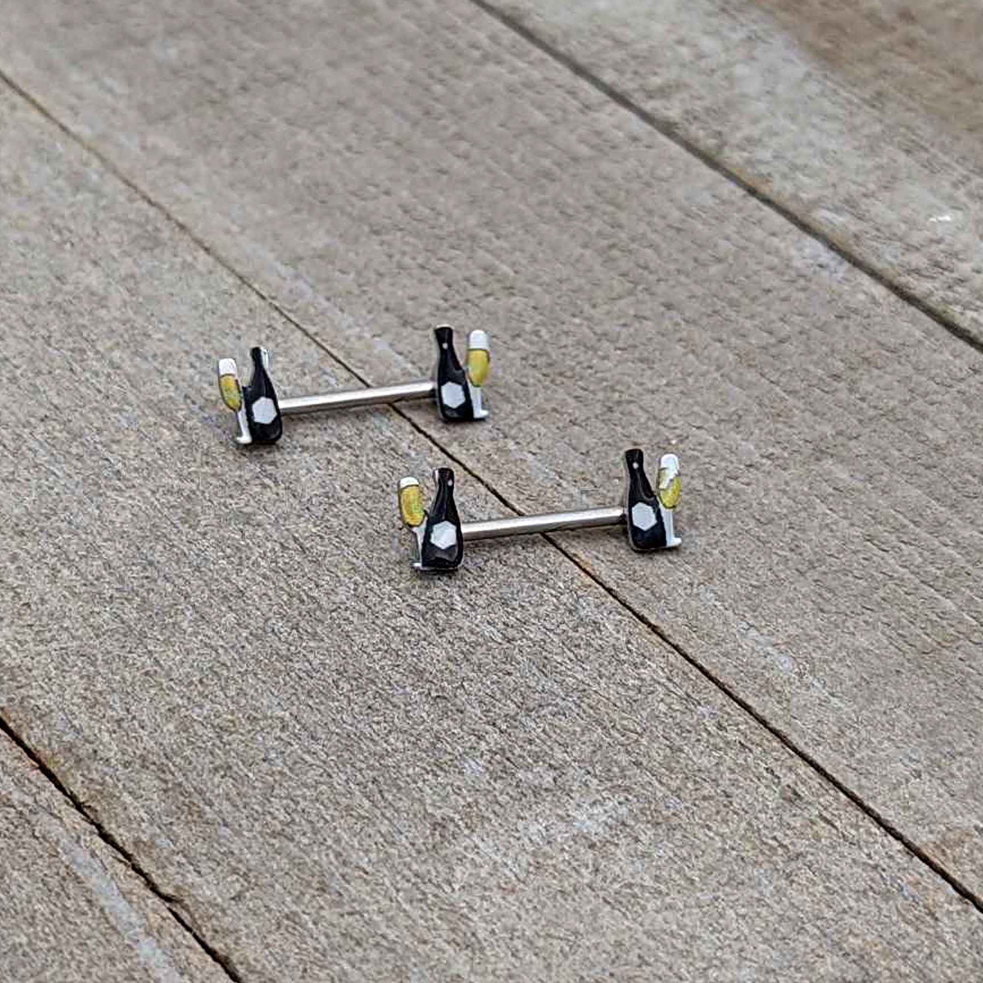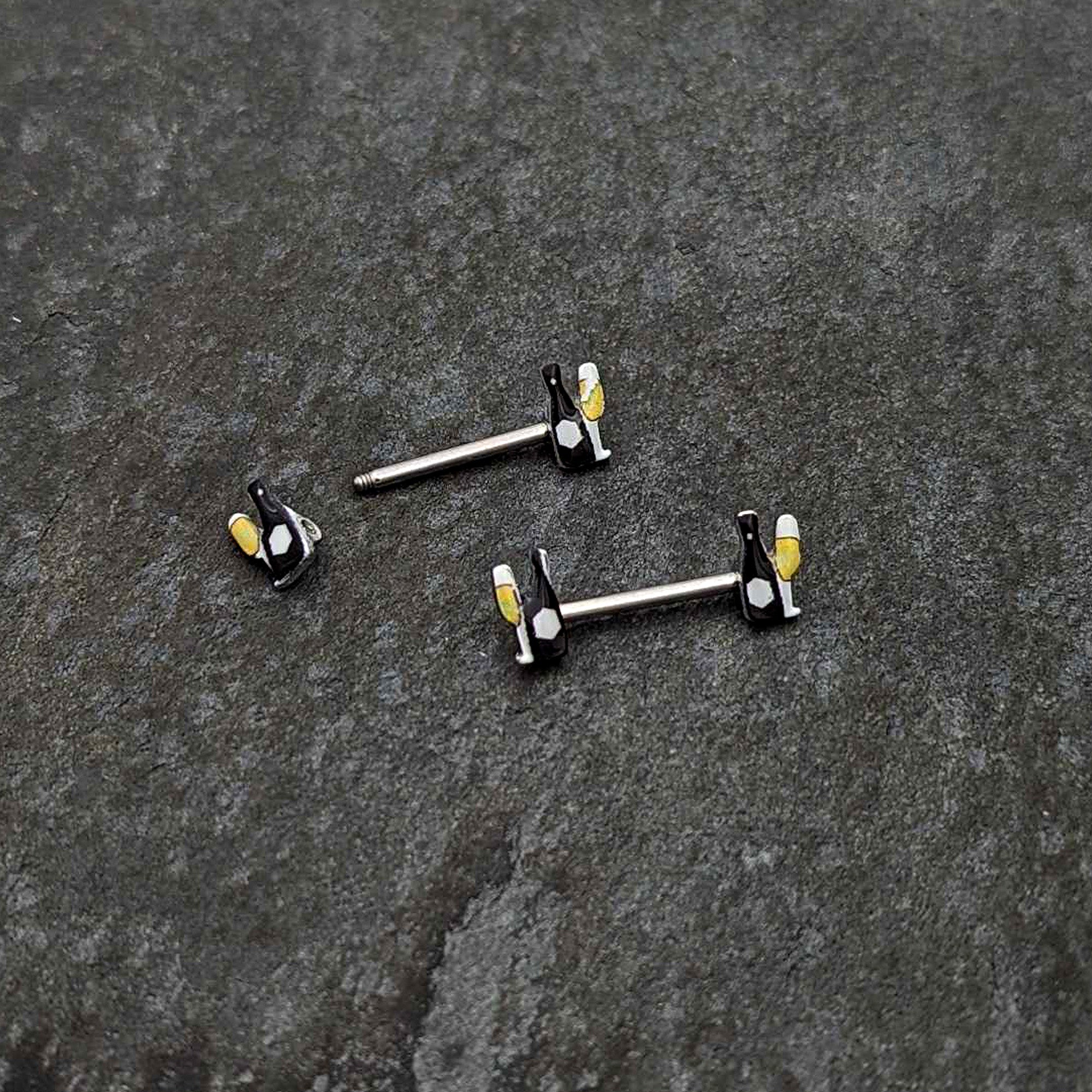 Pop the cork and ring in the new year with this elegantly styled 14 gauge nipple jewelry! It's made with 14mm durable 316L surgical grade stainless steel straight barbells. Each of the ends features a champagne charm, with the bottles inlaid in black with a grey label. Next to the bottles are matching champagne flutes with yellow inlaid bodies and bubble-inspired embellishments. You'll be ready to party when you're rocking these champagne themed nipple piercing rings! Sold as a set of two.
