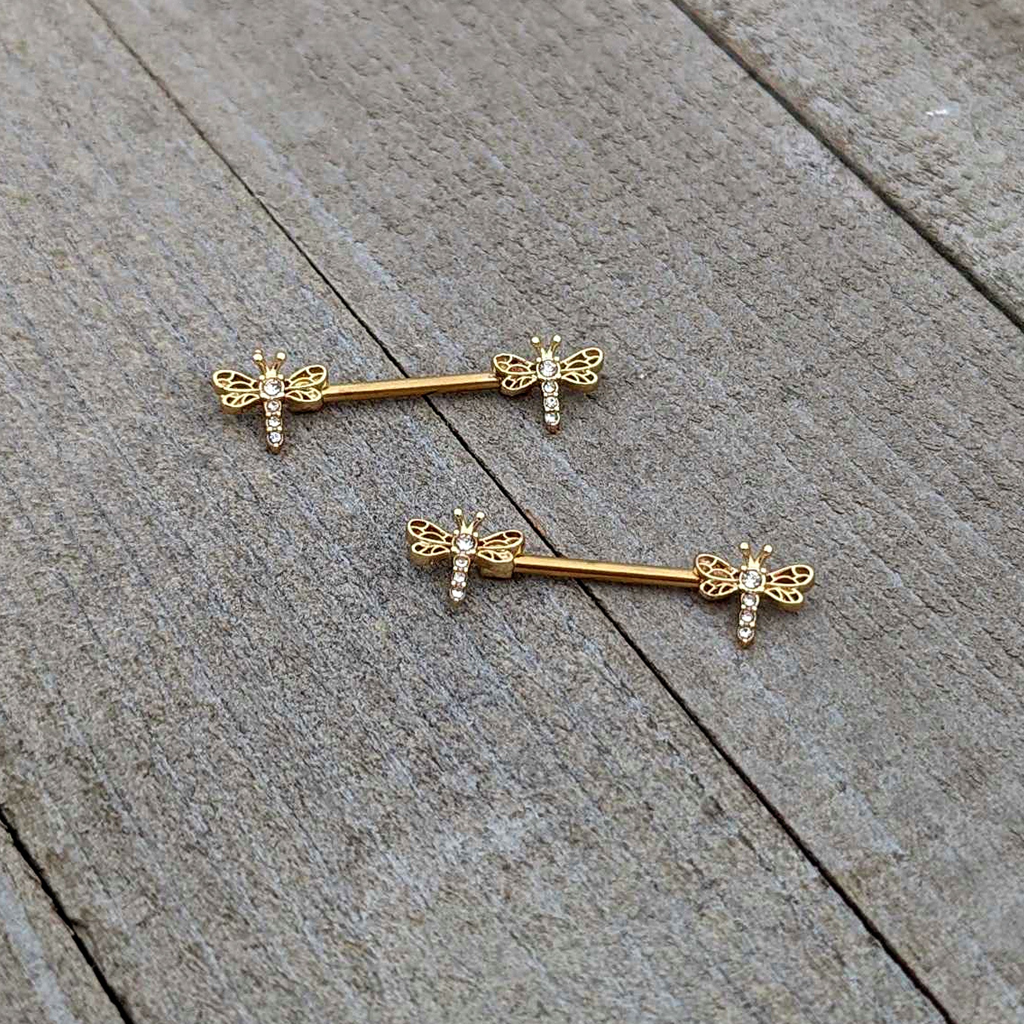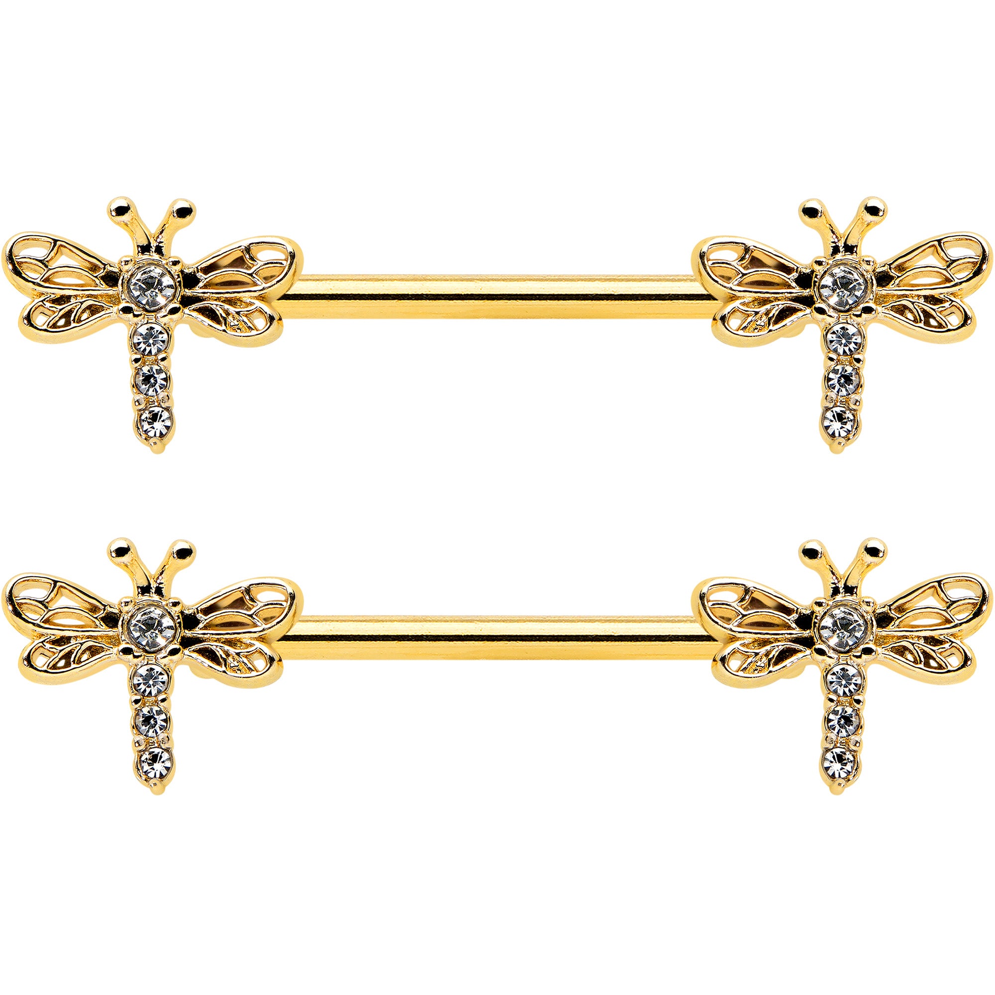 Let your look soar with this 14 gauge nipple jewelry! It's made with 14mm gold tone PVD over 316L surgical grade stainless steel straight barbells. Each of the ends features a dragonfly charm. The dragonflies feature openwork wings and bodies and tails composed entirely of small clear gems. You'll want to fly too when you're rocking these darling, dragonfly nipple piercing rings! Sold as a set of two.