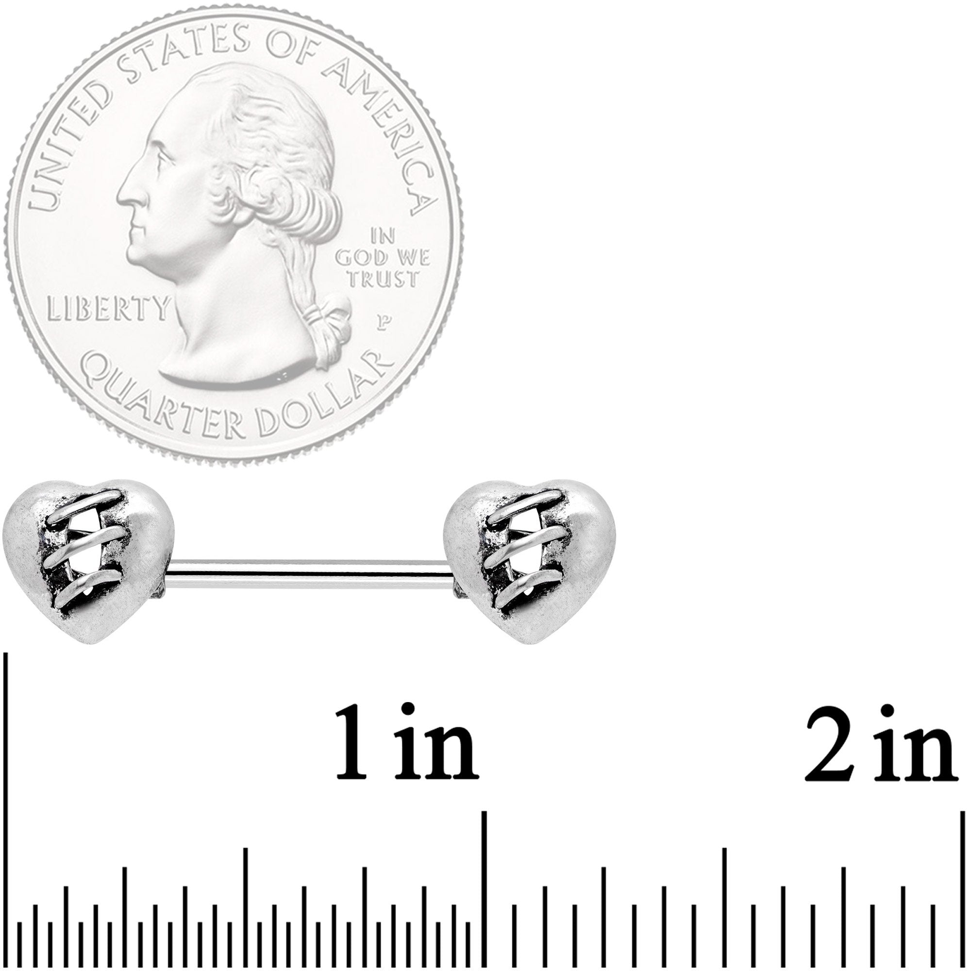 Nearly everyone has had their heart broken at least once and had the un-fun task of putting it back together again afterward. Well, now you can make that task just a little bit easier with these 14 gauge nipple piercings! They're made with 14mm durable 316L surgical grade stainless steel straight barbells. The feature ends shaped like hearts with three-dimensional stitching detail down the centers, clear signs of healing underway. So make that healing feel - and look - a whole lot better with this nipple jewelry! Sold as a set of two.