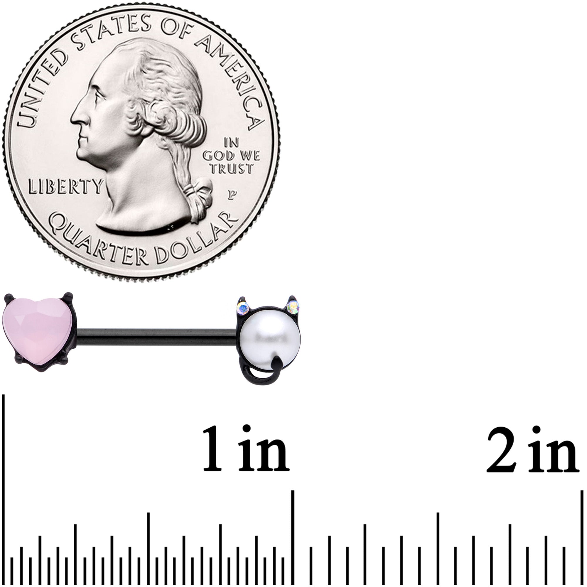 We all try to be good but sometimes it's more fun to be a bit of a devil! These 14 gauge nipple barbells are made with 14mm black PVD over 316L surgical grade stainless steel straight barbells. One end features a white pearlescent orb with aurora gems for horns. It also features a little black tail for extra detailing. The other end is a translucent pink gem heart, which adds a lovely pop of color to the pieces. These devilish little nipple piercings are bound to catch the eye and certain to steal your heart! Sold as a set of two.