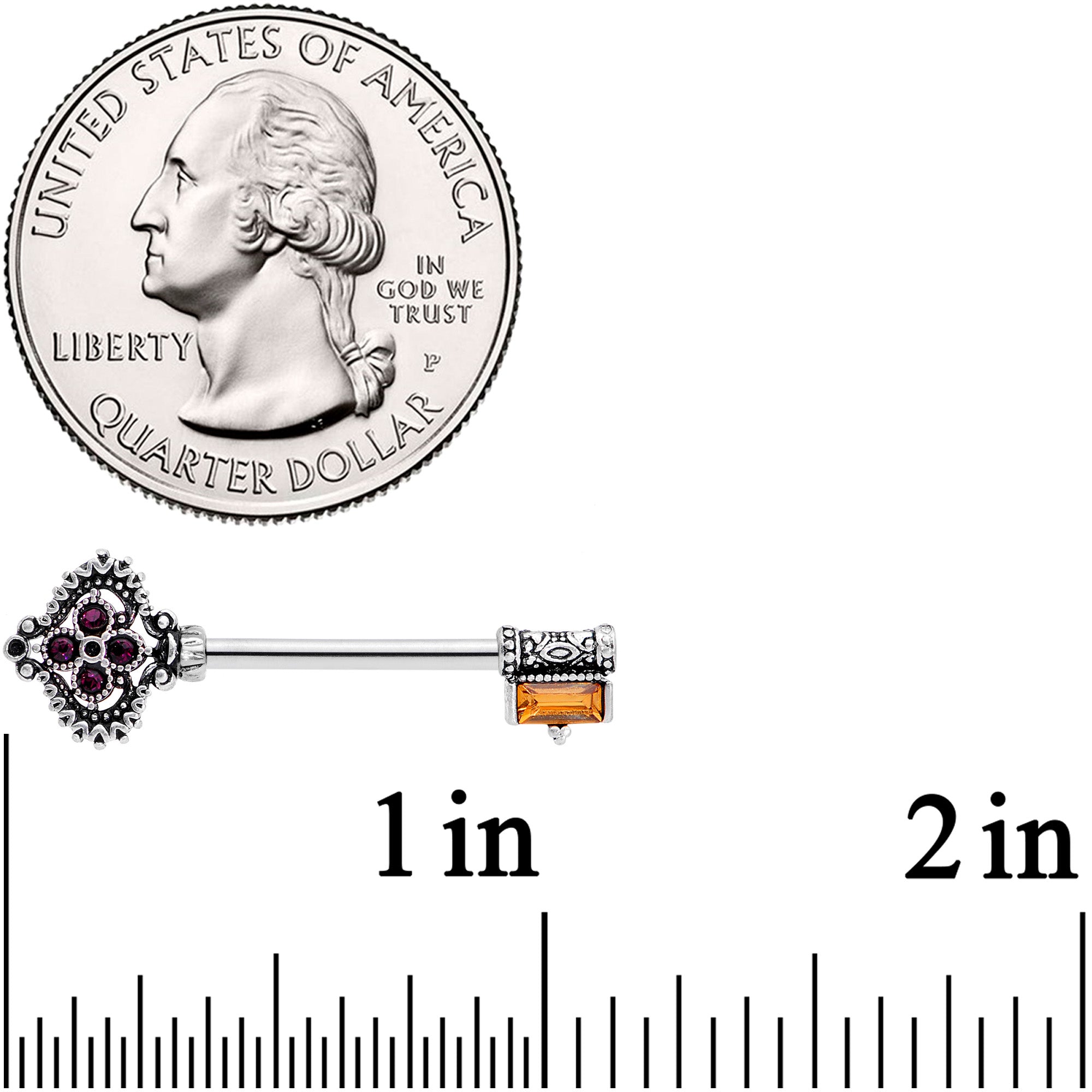 It may be the king's key but this 14 gauge nipple jewelry is perfectly suited for a queen! It's made with 14mm durable 316L surgical grade stainless steel straight barbells. One end features the key bow charm set with small red gems. The other end is the key's bit set with a rich brown gem that adds color and visual appeal. You'll feel like royalty with these in your nipple piercings! Sold as a set of two.