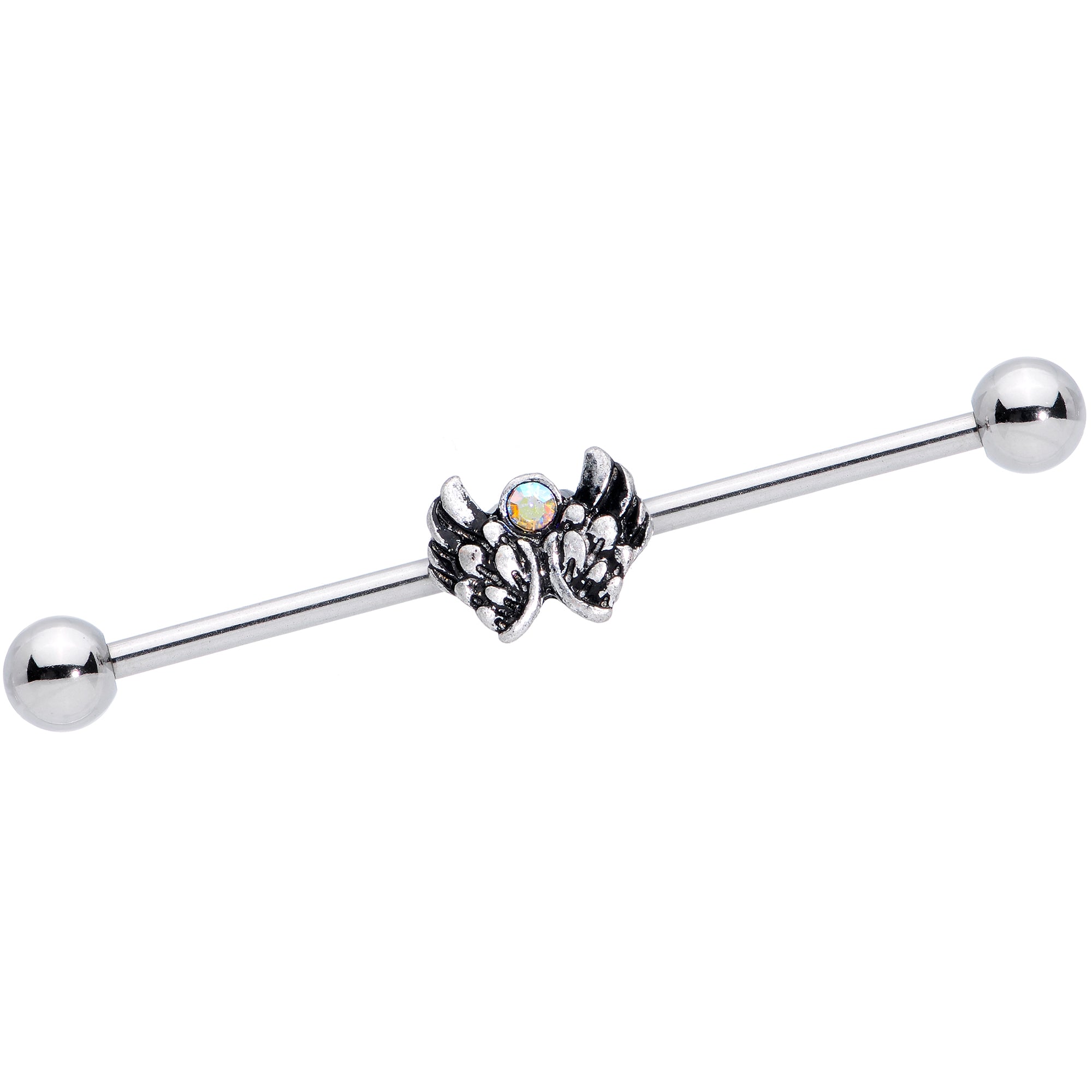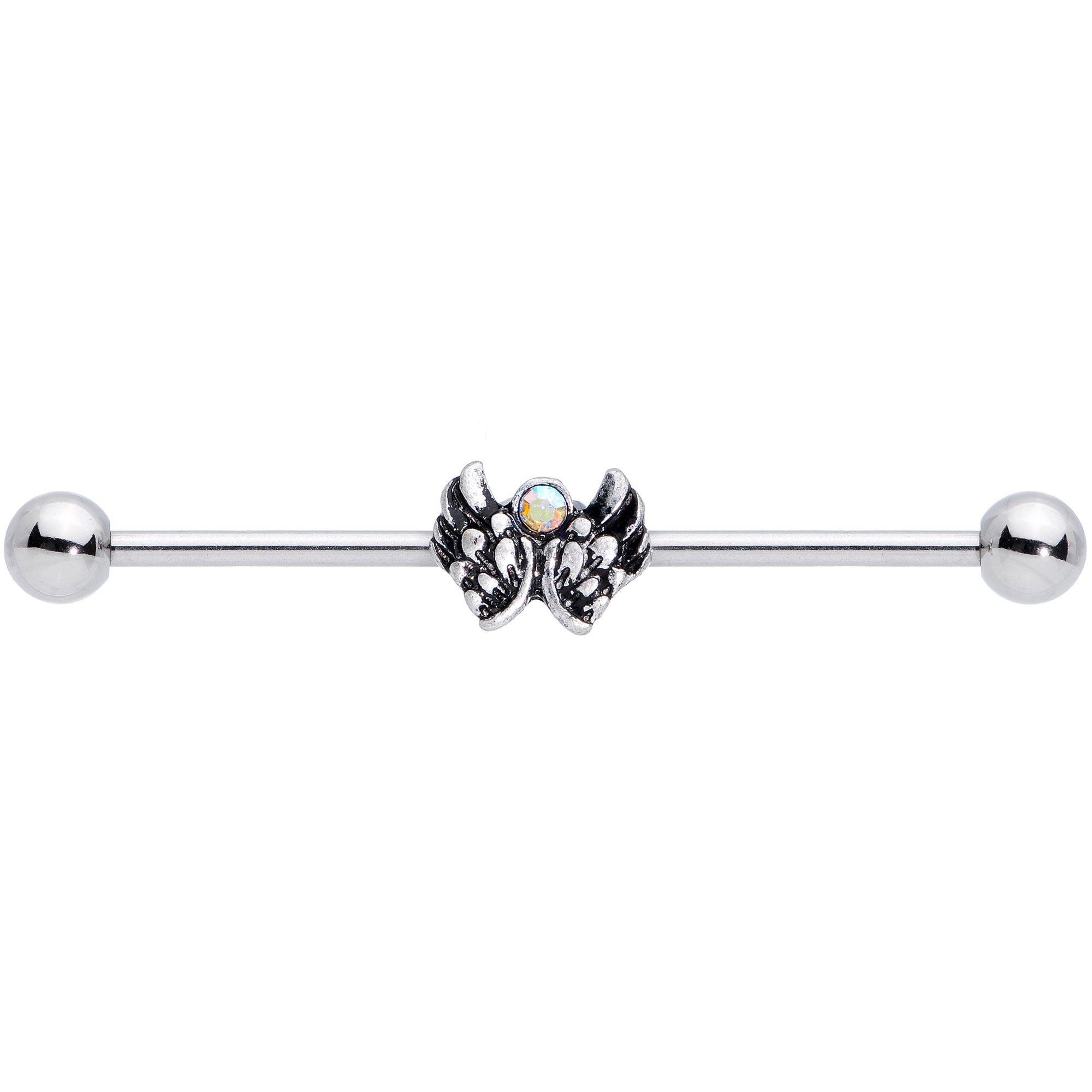 If you want to get whisked away this holiday on the wings of an angel then you will love this pretty 14 gauge industrial earring with an angelic look. Made with a 1 1/2" durable 316L surgical grade stainless steel straight barbell, this industrial jewelry features a moveable angel's wings charm set with an aurora gem and 5mm ball ends.