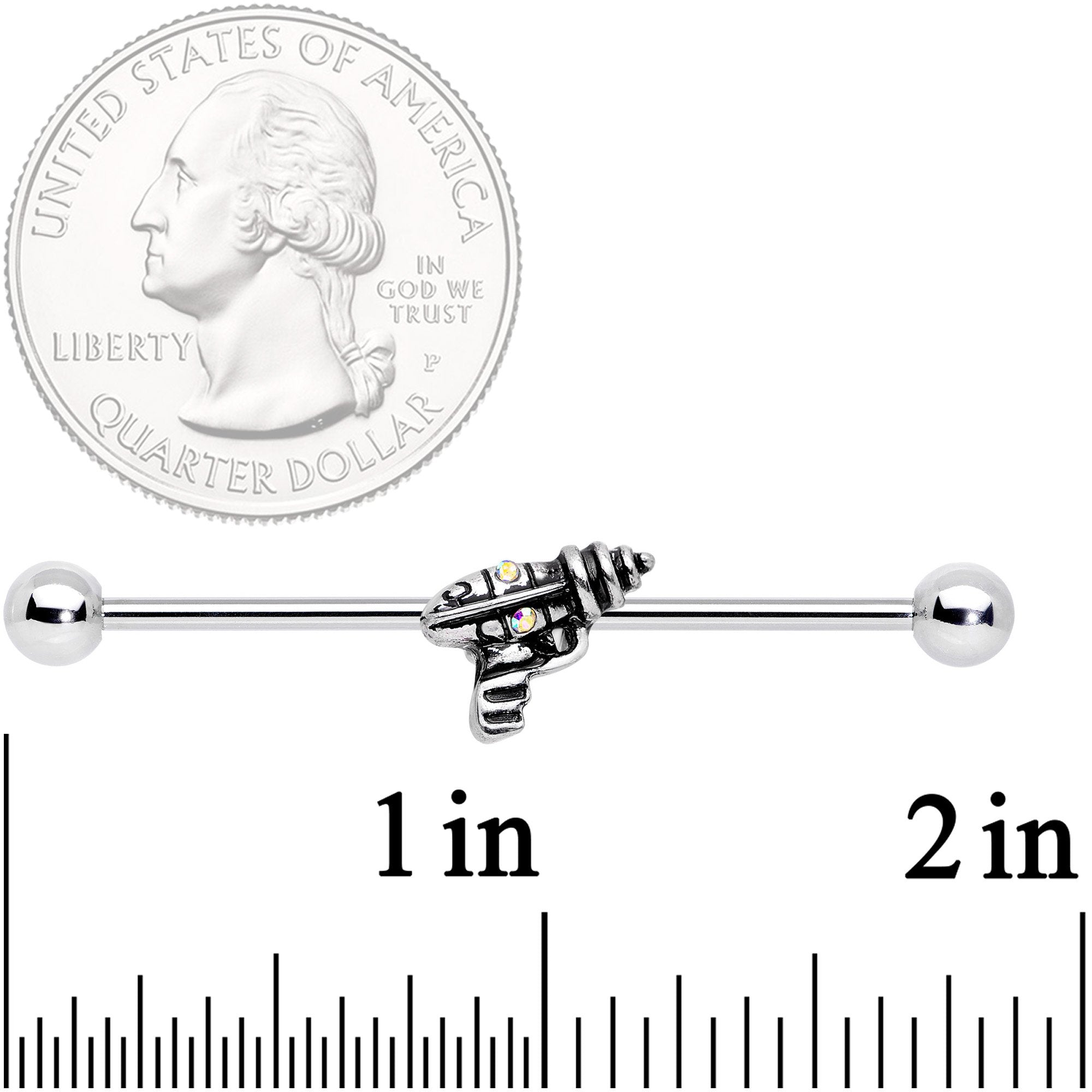 Are they shrink rays? Are they teleporter beams? This 14 gauge industrial earring will zap your look with a big dose of futuristic style! It's made with a 1 1/2" durable 316L surgical grade stainless steel straight barbell and has 5mm ball ends. It features a charm of a mysterious, ultra-modern looking raygun. The body is embellished with tiny aurora gems that really catch the eye and keep it from being overwhelmed by all the intricate detailing. And you can slide it up and down the length of the barbell to get just the look you're after! This industrial barbell is bound to leave your inner space traveler beaming with joy!