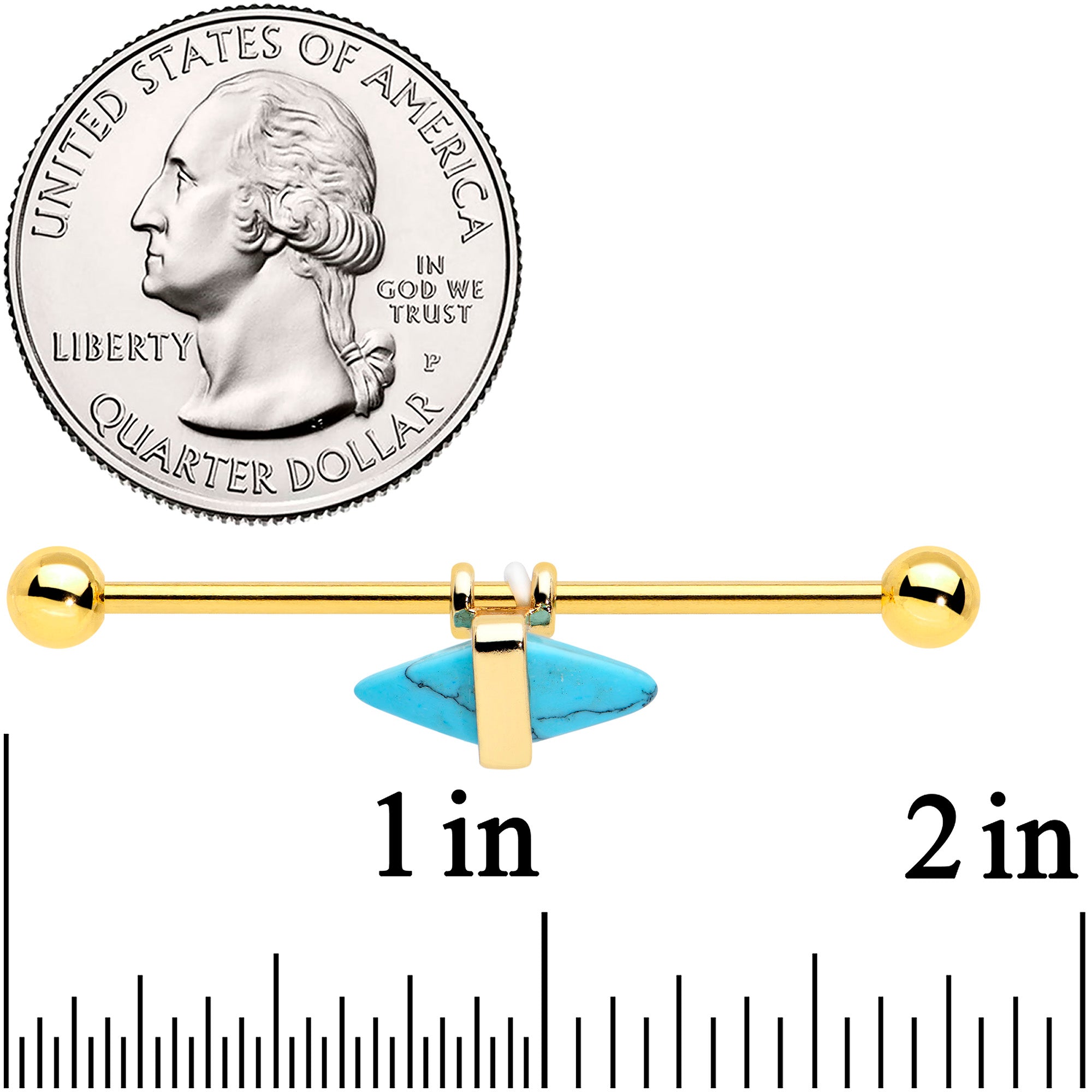 If you're into crystals and incense, this 14 gauge helix barbell is sure to give you a happier aura! It's made with a 1 1/2" gold tone PVD over 316L surgical grade stainless steel straight barbell with 5mm ball ends. It features a horizontal faux turquoise gem charm that would be so popular among the hippies of the 60s, with its classic obelisk shape. And you can slide the charm up and down the length of the barbell to get the perfect look. While we can't claim it has any magical powers, it will certainly look magical in your industrial piercing!