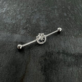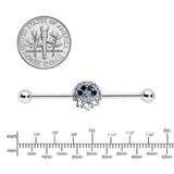 The curve on this 14 gauge helix barbell is sure to catch eyes! It's made with a 1 1/2" durable 316L surgical grade stainless steel straight barbell with 5mm ball ends. It features an abstract arch charm, with the outermost rim set with textured embellishment and the inner curve set with deep blue gems. Below that is an abstract flower design with a clear gem center. You can even slide it up and down the length of the barbell for the perfect look. Get abstract with this elegant barbell earring!