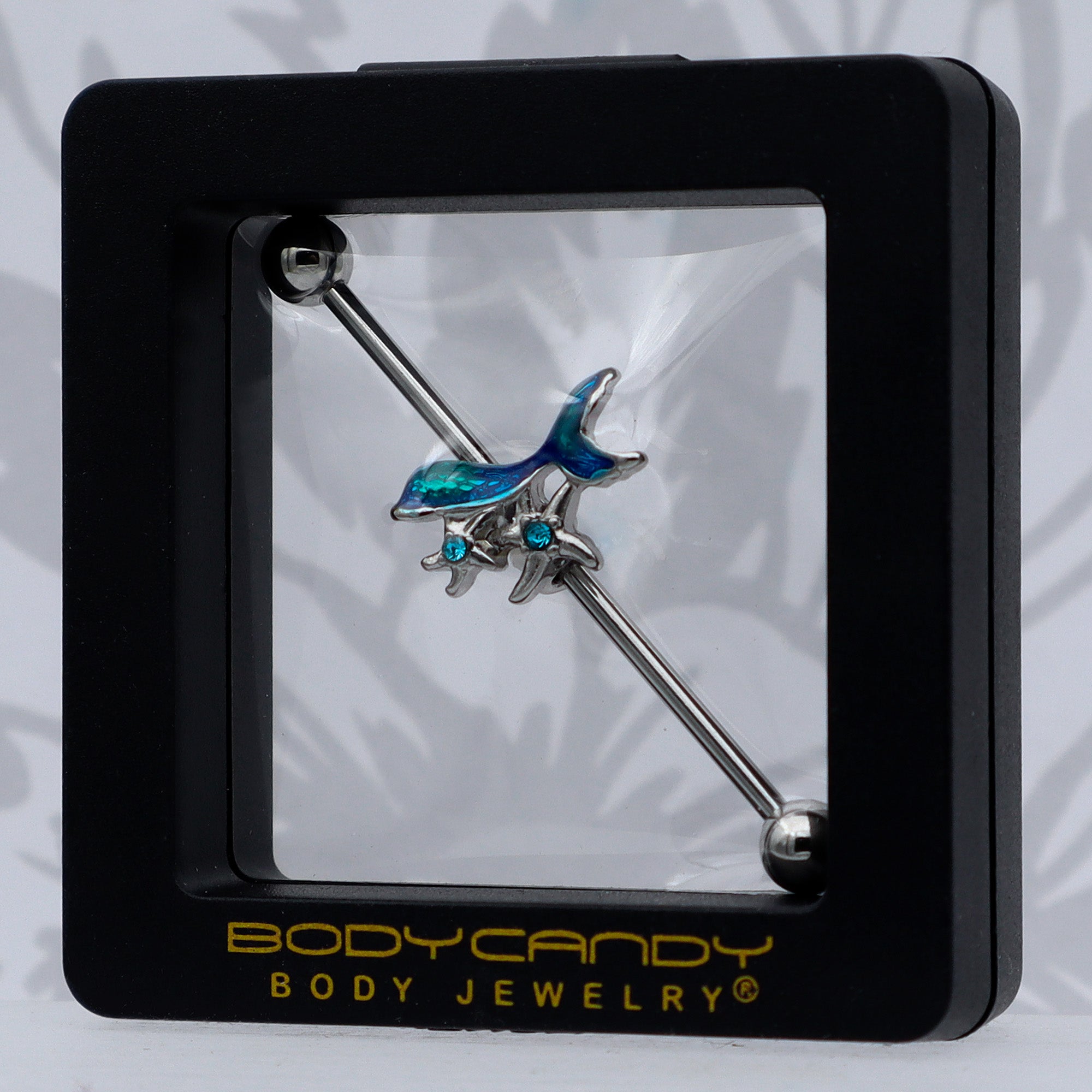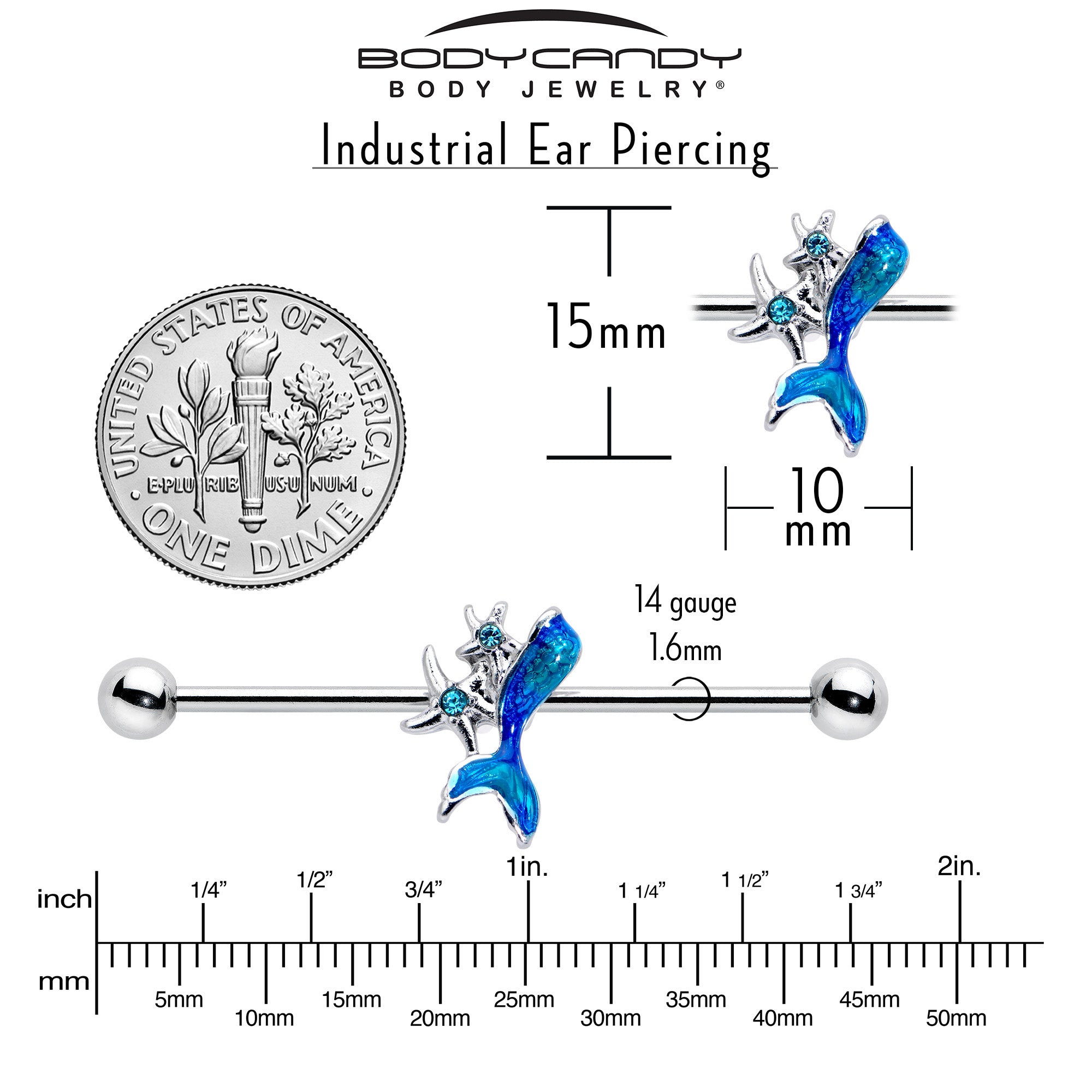 Be the star of sea and of land with this 14 gauge helix barbell. It is made with a 1 1/2 inch 316L surgical grade stainless steel straight barbell with 5mm ball ends. It features a blue inlaid mermaids tail charm. It is further embellished with a pair of starfish, set with blue gems at their centers. You can even slide it up and down the length of the barbell for the perfect look. Let your look tell a tale with a tail, when you are rocking this marvelous mermaid barbell earring.
