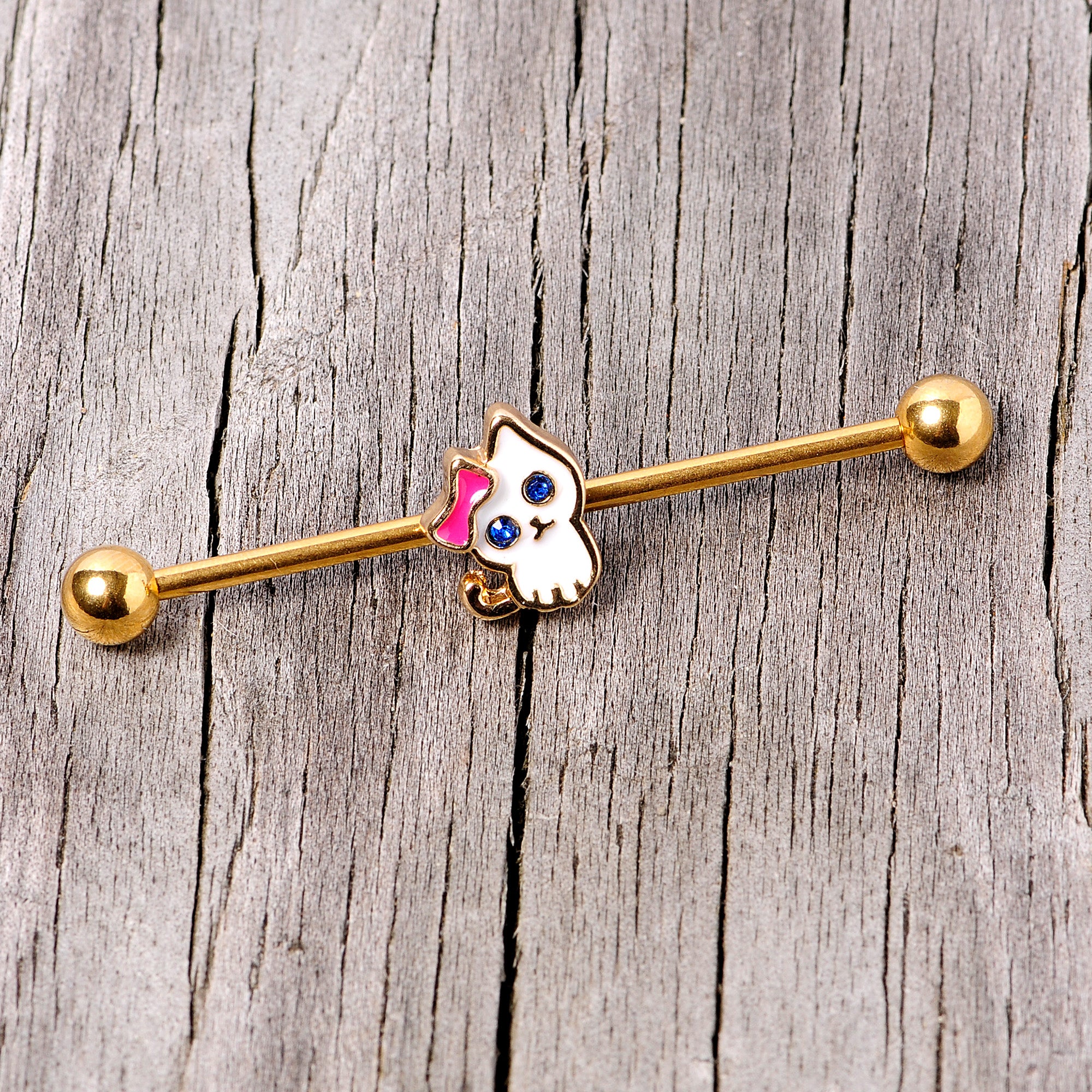 This 14 gauge pretty kitty is flaunting her big blue eyes in hopes that someone will give her a fur-ever home! This helix barbell is made with a 1 1/2" gold tone PVD over 316L surgical grade stainless steel straight barbell with 5mm ball ends. It features a white kitty cat charm with blue gem eyes and a pretty pink bow. And you can slide her up and down the length of the barbell industrial so you get just the look you're after. So go ahead and take this cat barbell earring home - she's sure to look purrfect in your helix piercing!