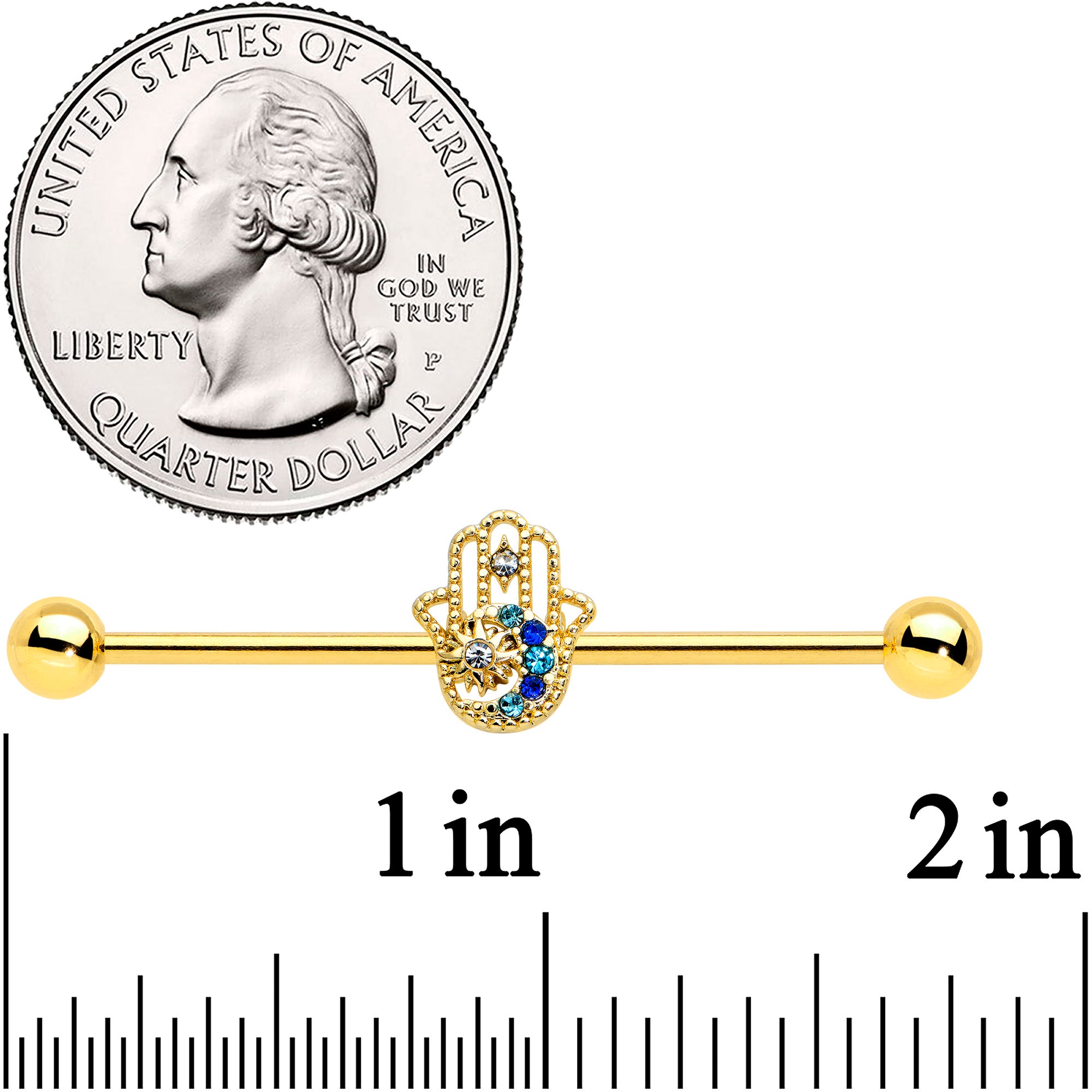 14 Gauge Blue Gem Gold Tone Texture Hamsa Hand Industrial Barbell 38mm