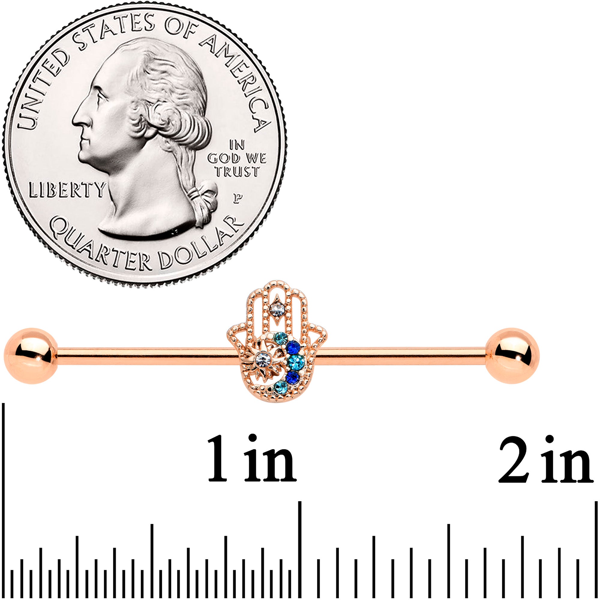 14 Gauge Blue Gem Rose Gold Hue Texture Hamsa Industrial Barbell 38mm