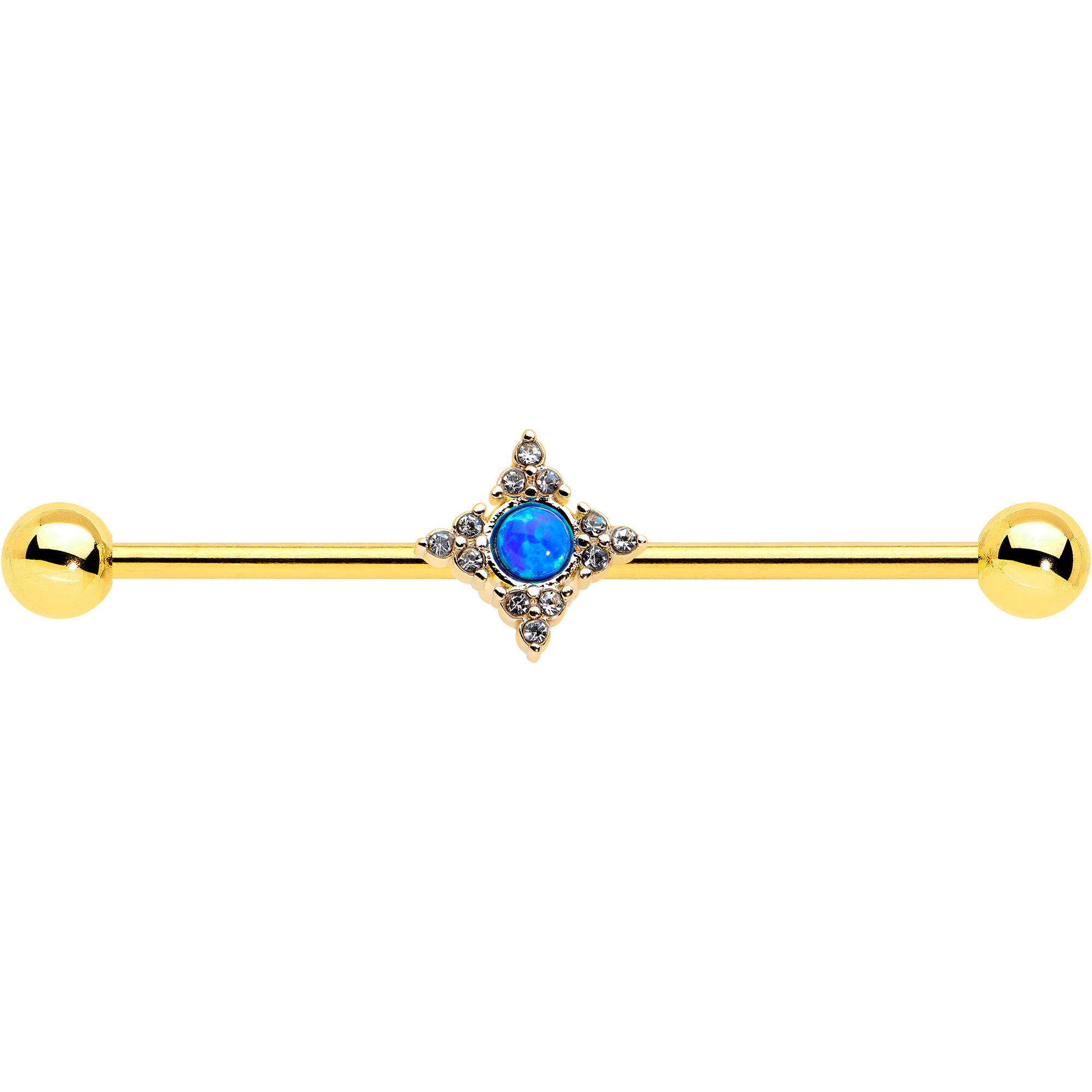 14 Gauge Blue Synthetic Opal Gold Tone Rhombus Industrial Barbell 38mm
