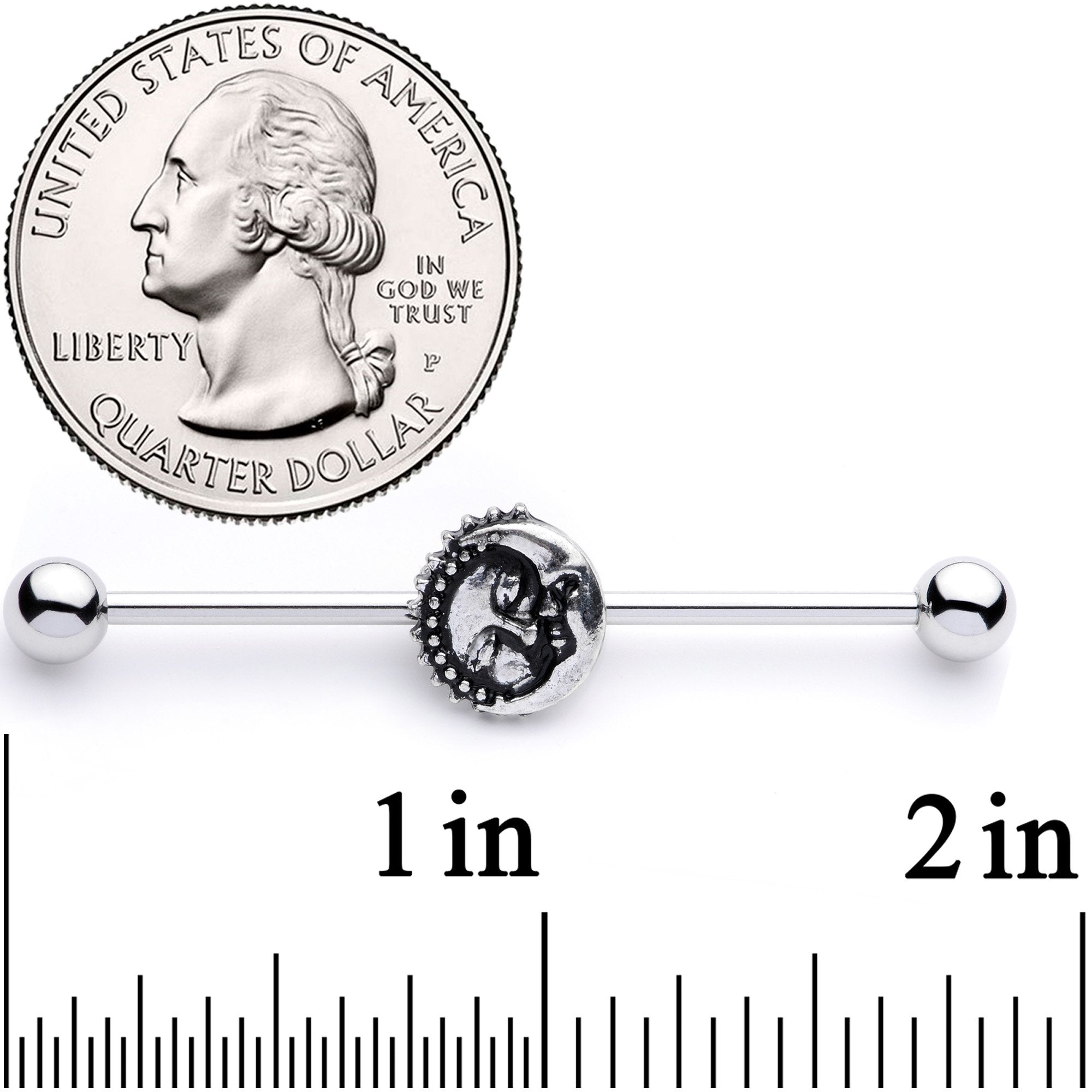 The sun and the moon rarely meet, but it appears that they've fallen in love! This 14 gauge industrial earring is made with a 1 1/2" durable 316L surgical grade stainless steel straight barbell with 5mm ball ends. It features a silver tone charm of the crescent moon, curved to wrap itself around the sun with an expression of supreme contentment engraved on its face. The sun also has an expression of total peace engraved face, as well as textured detailing to suggest its rays. Like the sun and moon orbit the Earth, they also move on this earring, able to be slid up and down the length of the barbell so you can get exactly the look you want. You'll fall in love with this industrial earring!