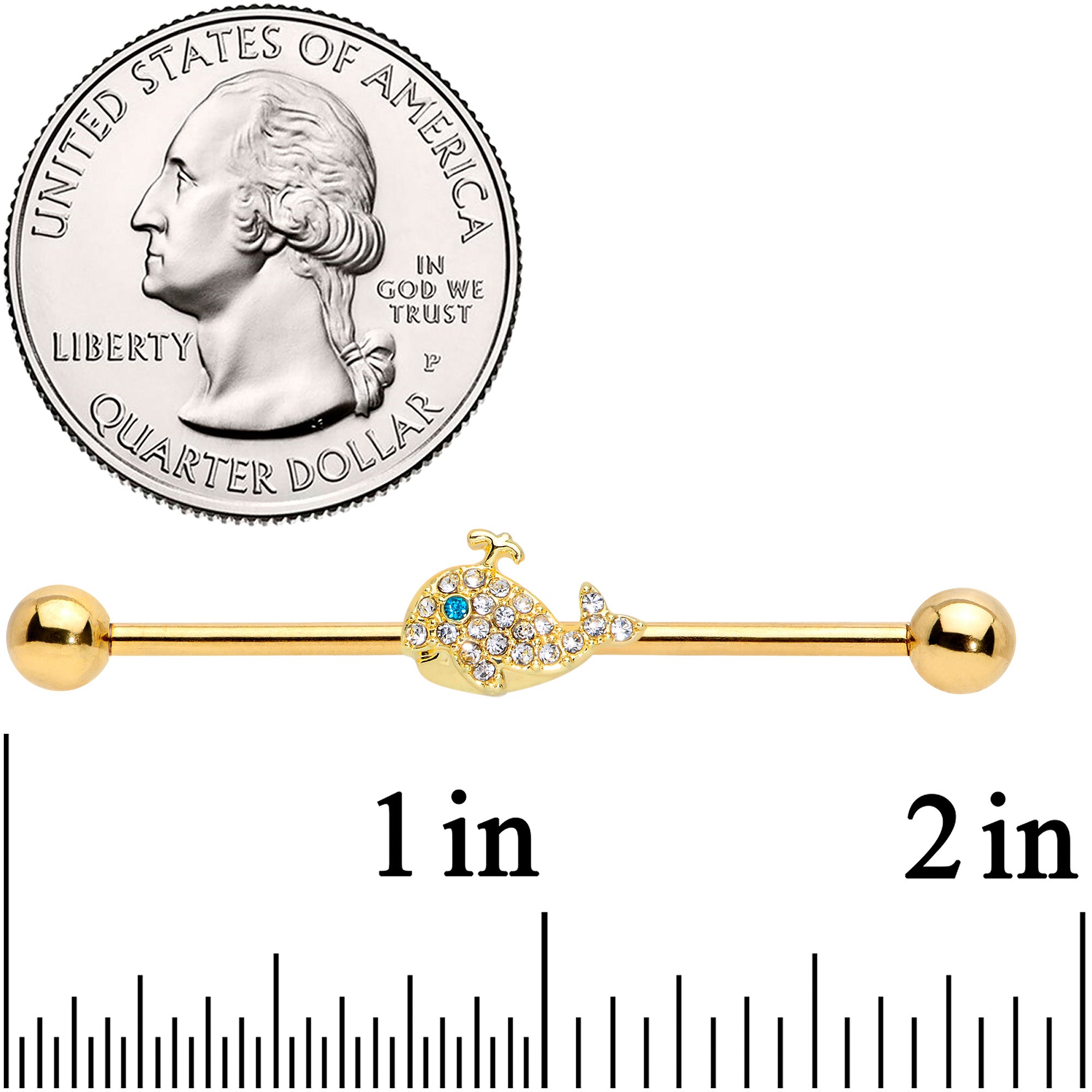 14G Clear Aqua Gem Gold Tone Whale Industrial Barbell 38mm
