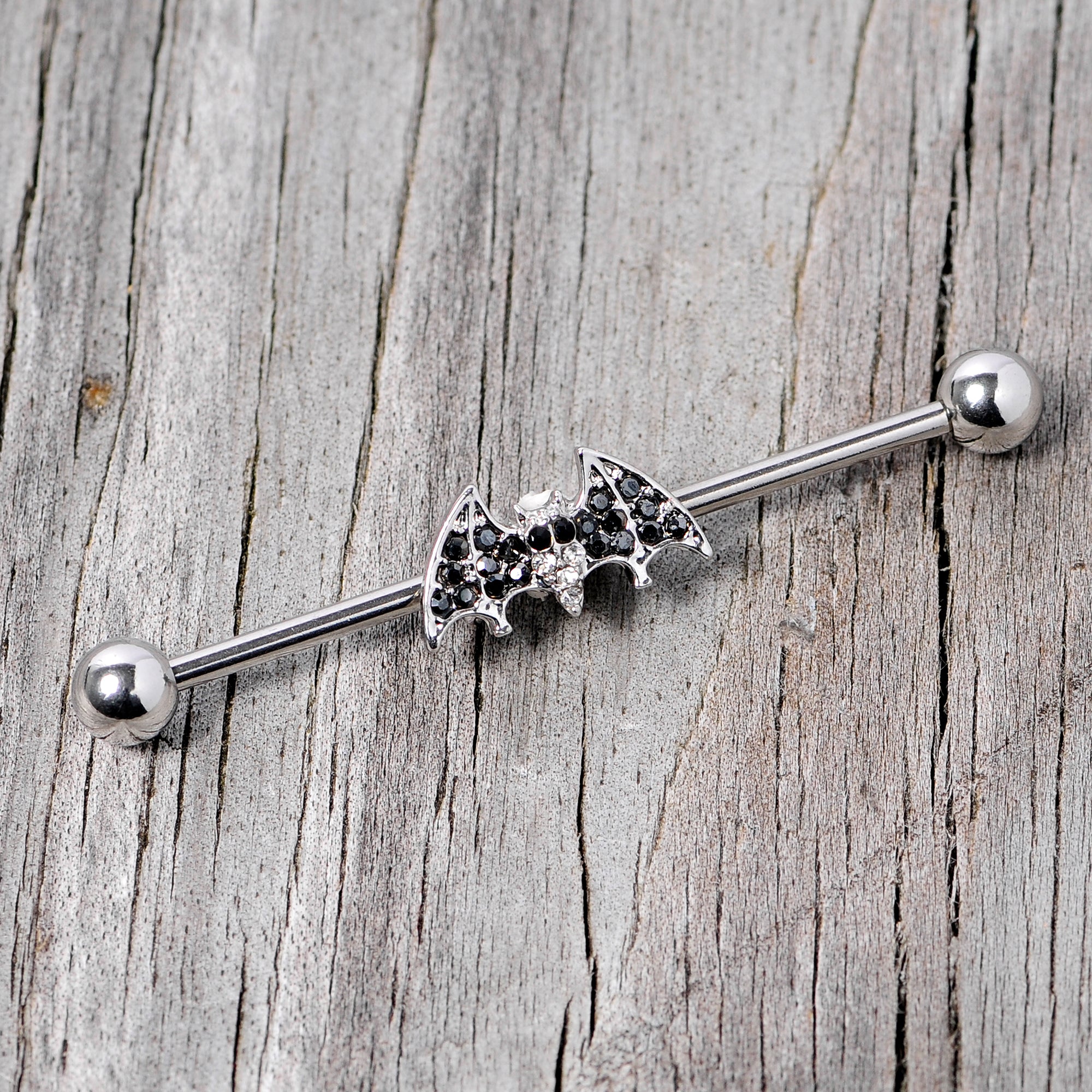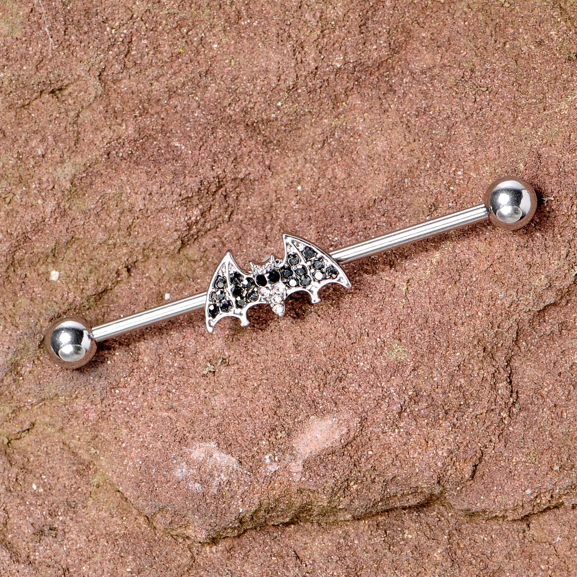 Don't look now but this 14 gauge industrial earring is absolutely batty! Made with a 1 1/2" durable 316L surgical grade stainless steel straight barbell, this double helix earring features a moveable vampire bat charm with clear and black gems for scary Halloween style.