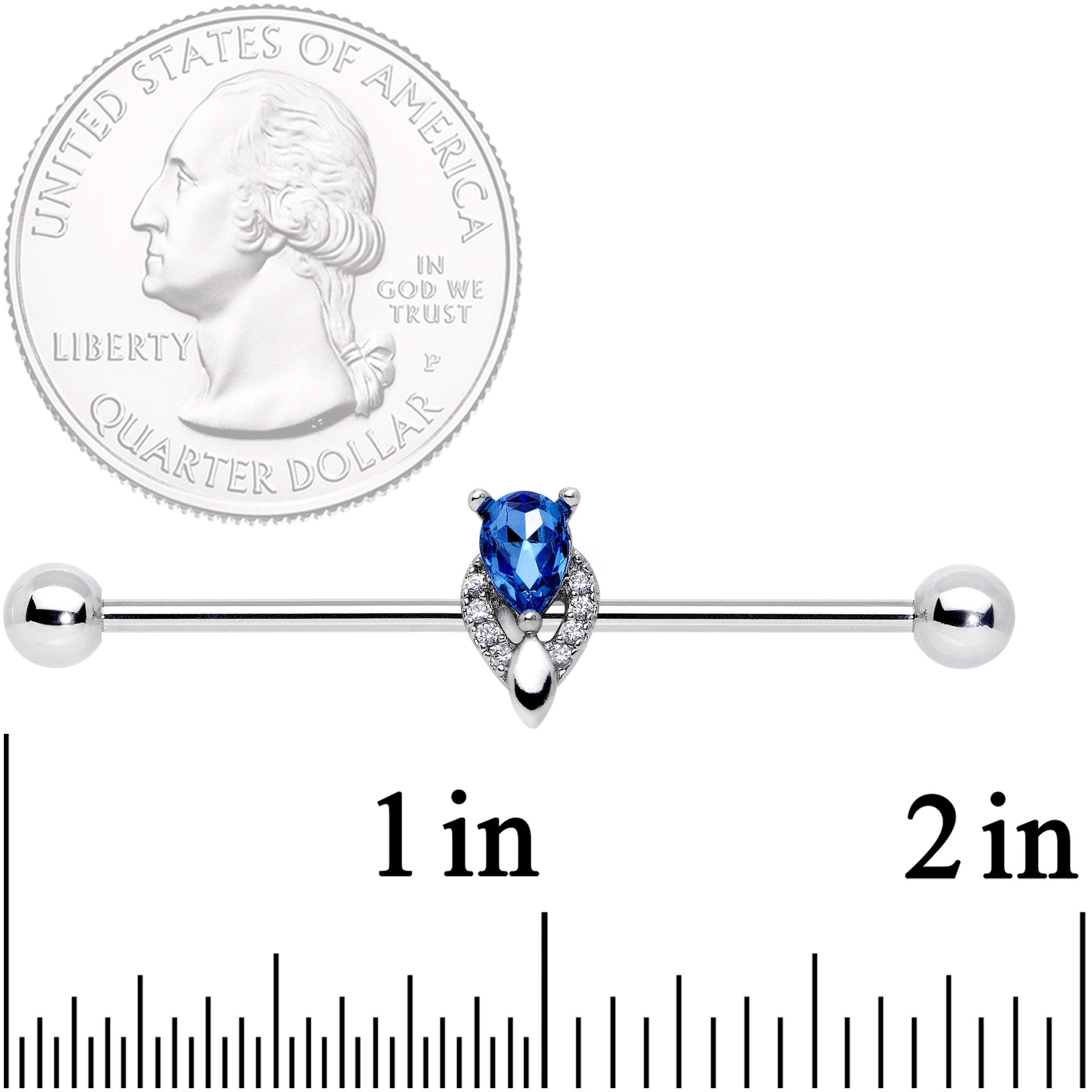 This 14 gauge industrial earring is bound to take you back in time! It's made with a 1 1/2" durable 316L surgical grade stainless steel straight barbell with 5mm ball ends. It features an Art Deco-inspired design of clear gems in a circular shape, meeting at the bottom to embrace a large blue gem, shaped like a drop that can be slid up and down the length of the barbell so you get just the look you want. You get all the glamour of an antique in a very modern piece of body jewelry!