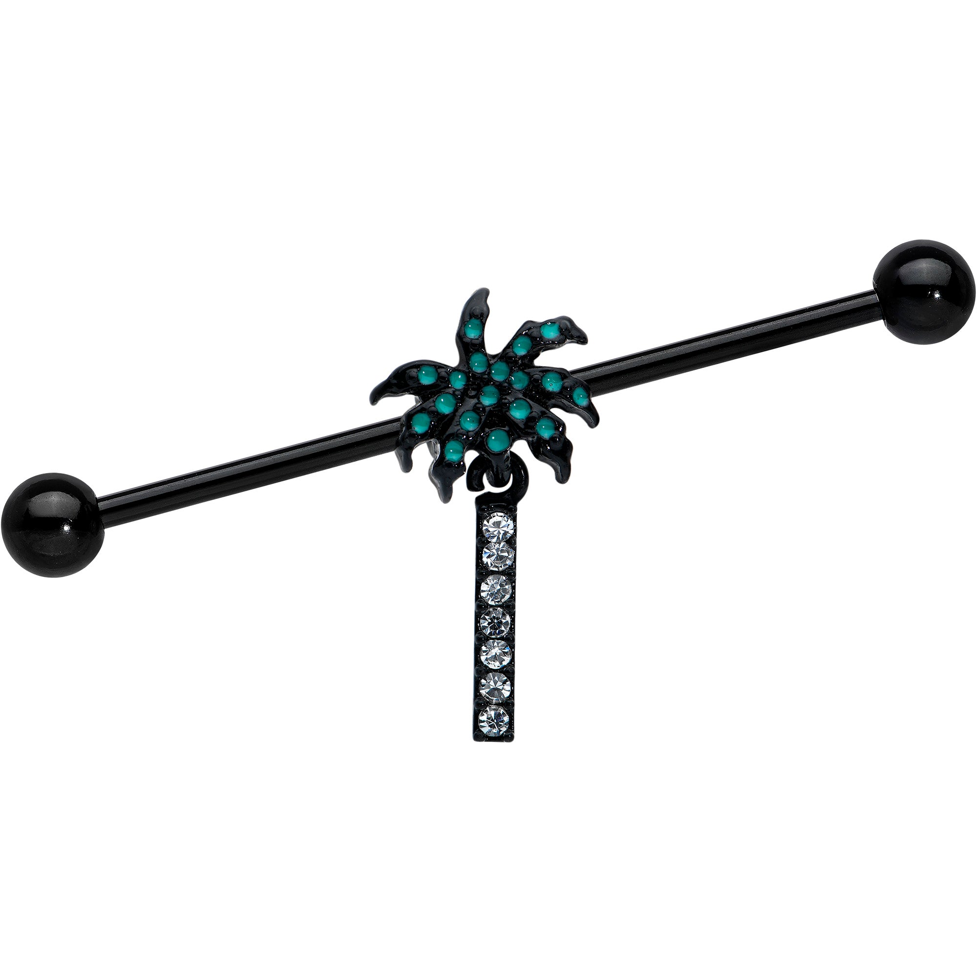 14 Gauge Clear Gem Black Night Palm Tree Dangle Industrial Barbell 38mm