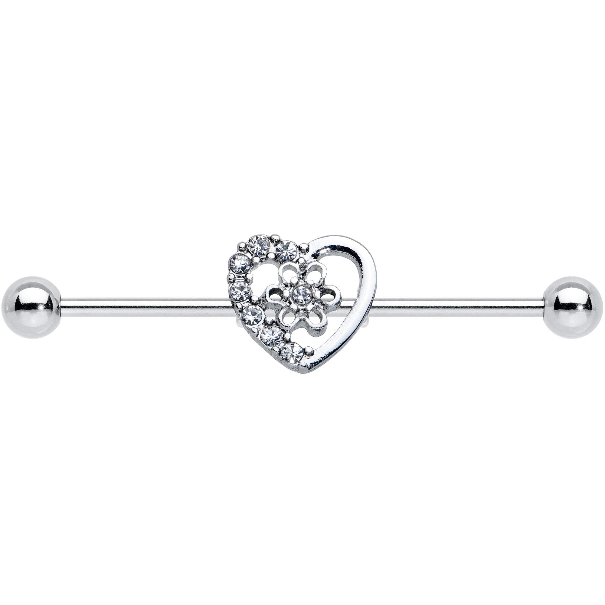 14 Gauge Clear Gem Floral Hollow Heart Industrial Barbell 38mm