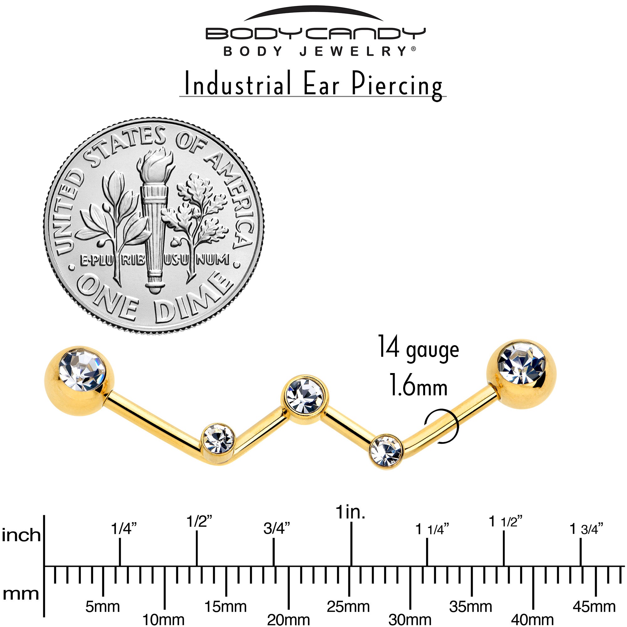Connect the stars and style your ear with them when you're rocking this 14 gauge helix barbell. It's made with a 1 1/4 inch gold tone PVD over 316L surgical grade stainless steel project bar. It features a a zig zag design that connects the 6mm ball ends, which are set with forward facing clear gems. It is further set with clear gems along the length, giving it the look of a constellation in the night sky. Don't just be a star when you can be an entire constellation with this elegant barbell earring.