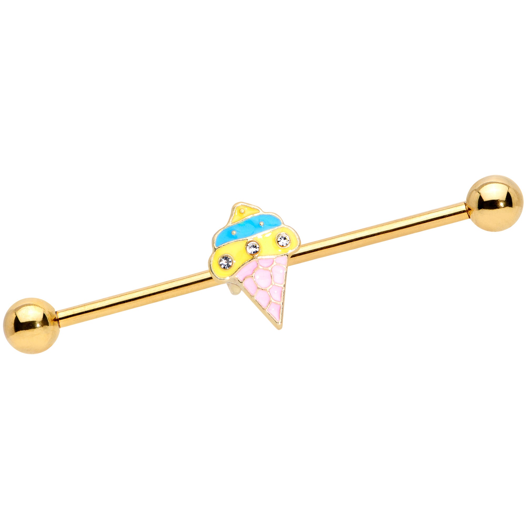 14 Gauge Clear Gem Gold Tone Ice Cream Cone Industrial Barbell 38mm