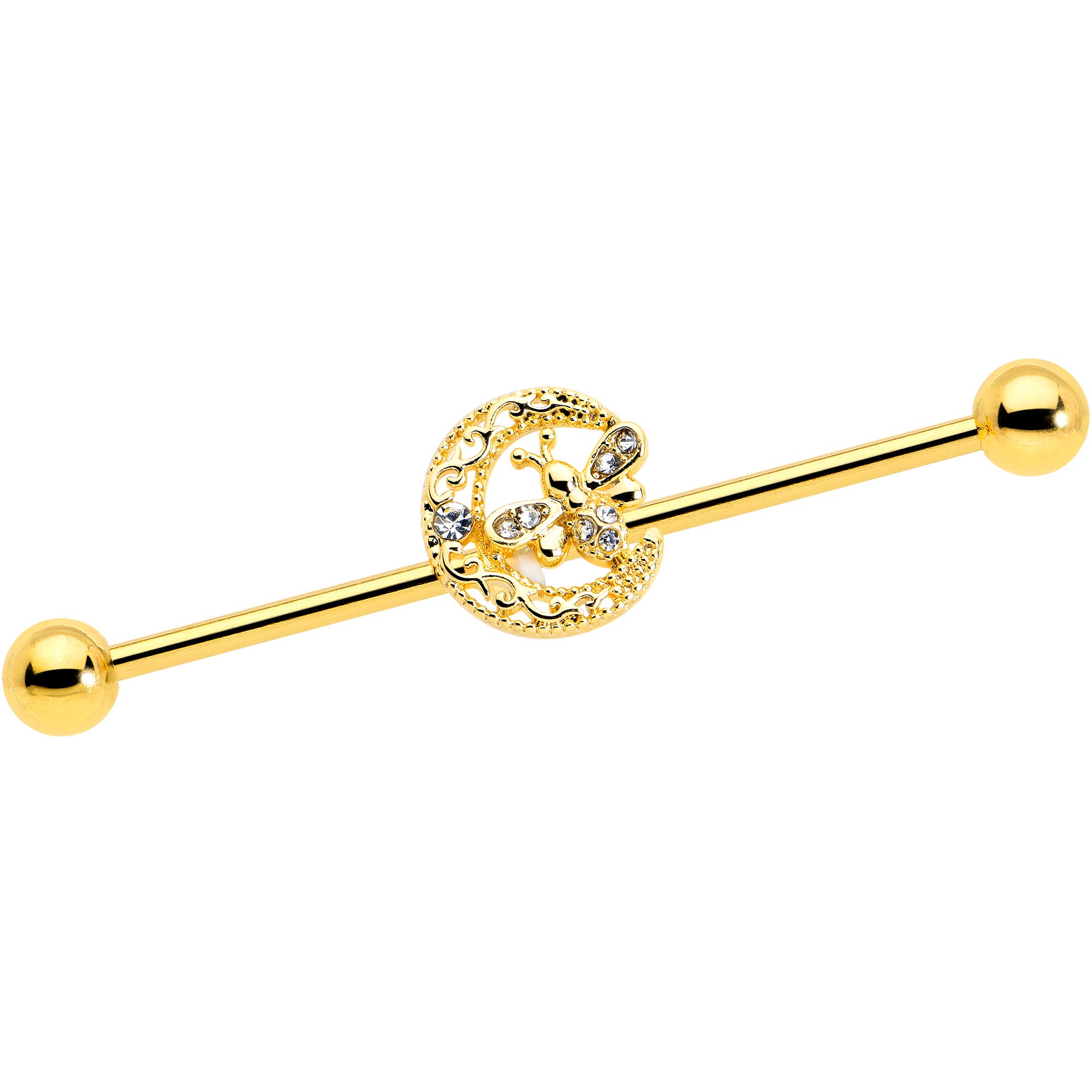 14 Gauge Clear Gem Gold Tone Lunar Dragonfly Industrial Barbell 38mm