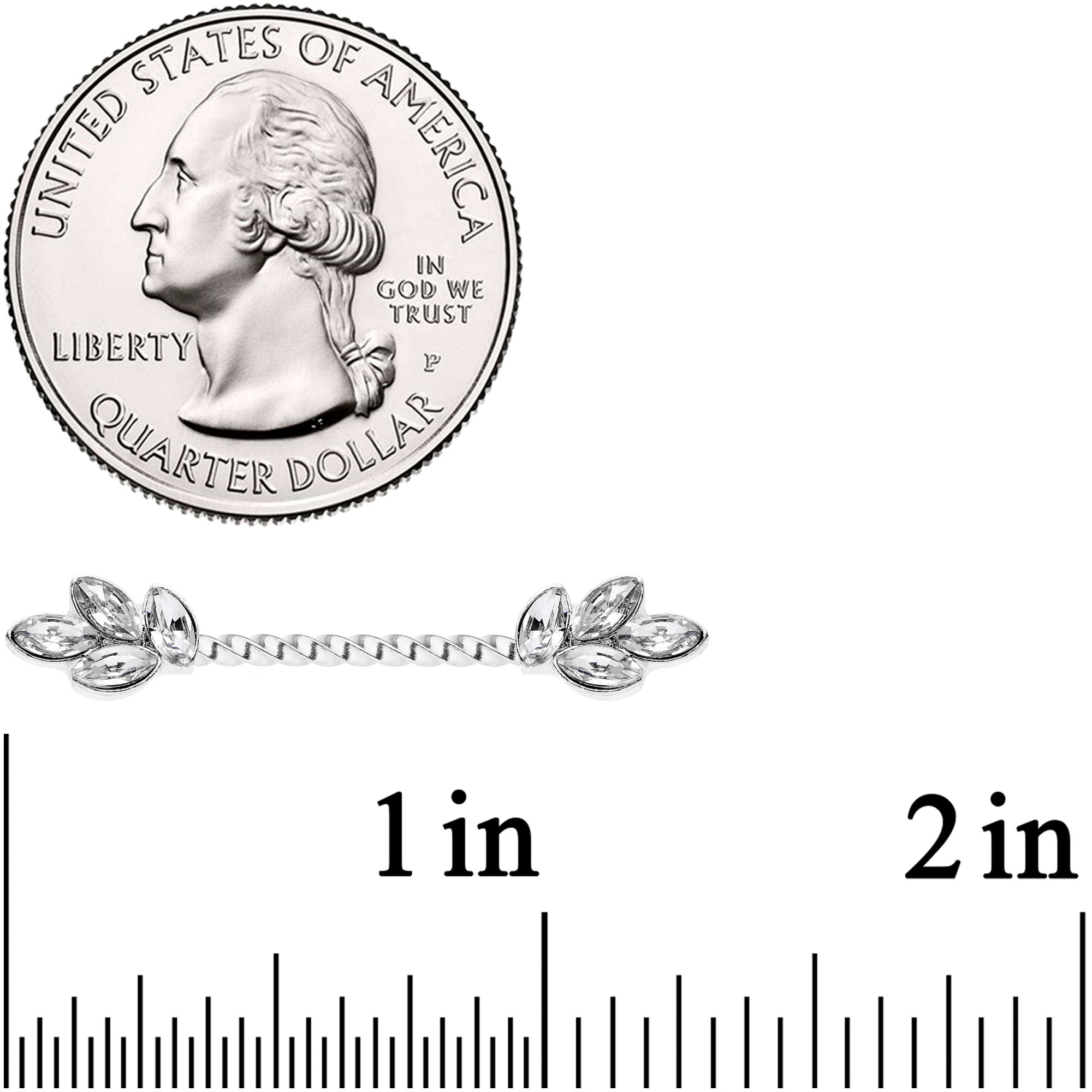 This 14 gauge nipple jewelry has a look of classic elegance....with a twist! They're made with 16mm durable 316L surgical grade stainless steel twisted straight barbells. The ends feature four clear gems with the appearance of a small spray of leaves. Once you have them in your nipple piercings you won't want to let them leaf! Sold as a set of two.