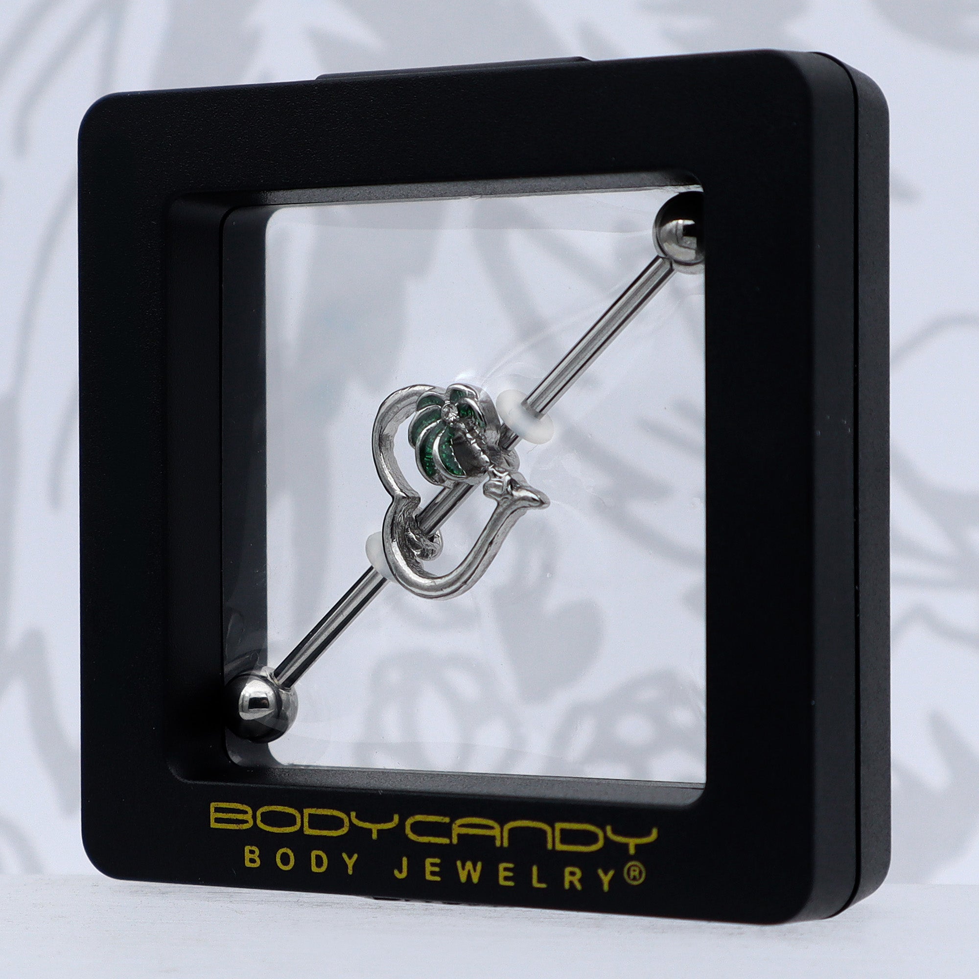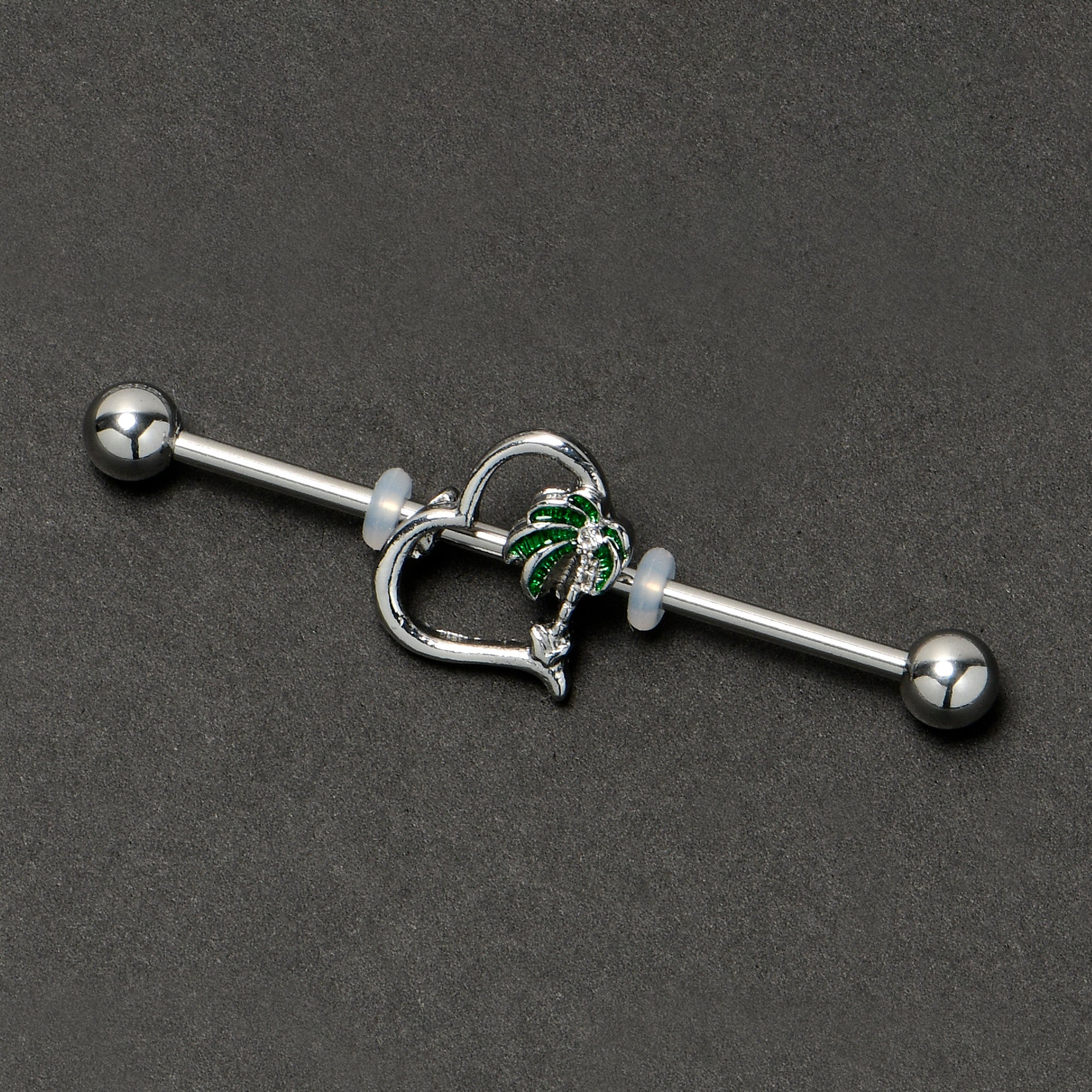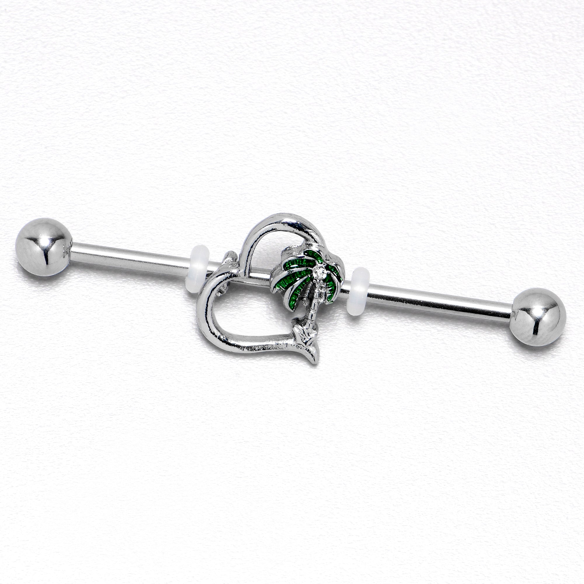 Show off your love for balmy weather and palmy trees with this 14 gauge helix barbell. It is made with a 1 1/2 inch 316L surgical grade stainless steel straight barbell with 5mm ball ends. It features a hollow heart charm. One side of the heart is composed of a palm tree, with green leaf detailing and a clear gem embellishment and you can even slide it up and down the length of the barbell for the perfect look. You will look just as hot as the weather when you are rocking this palm tree and heart barbell earring.